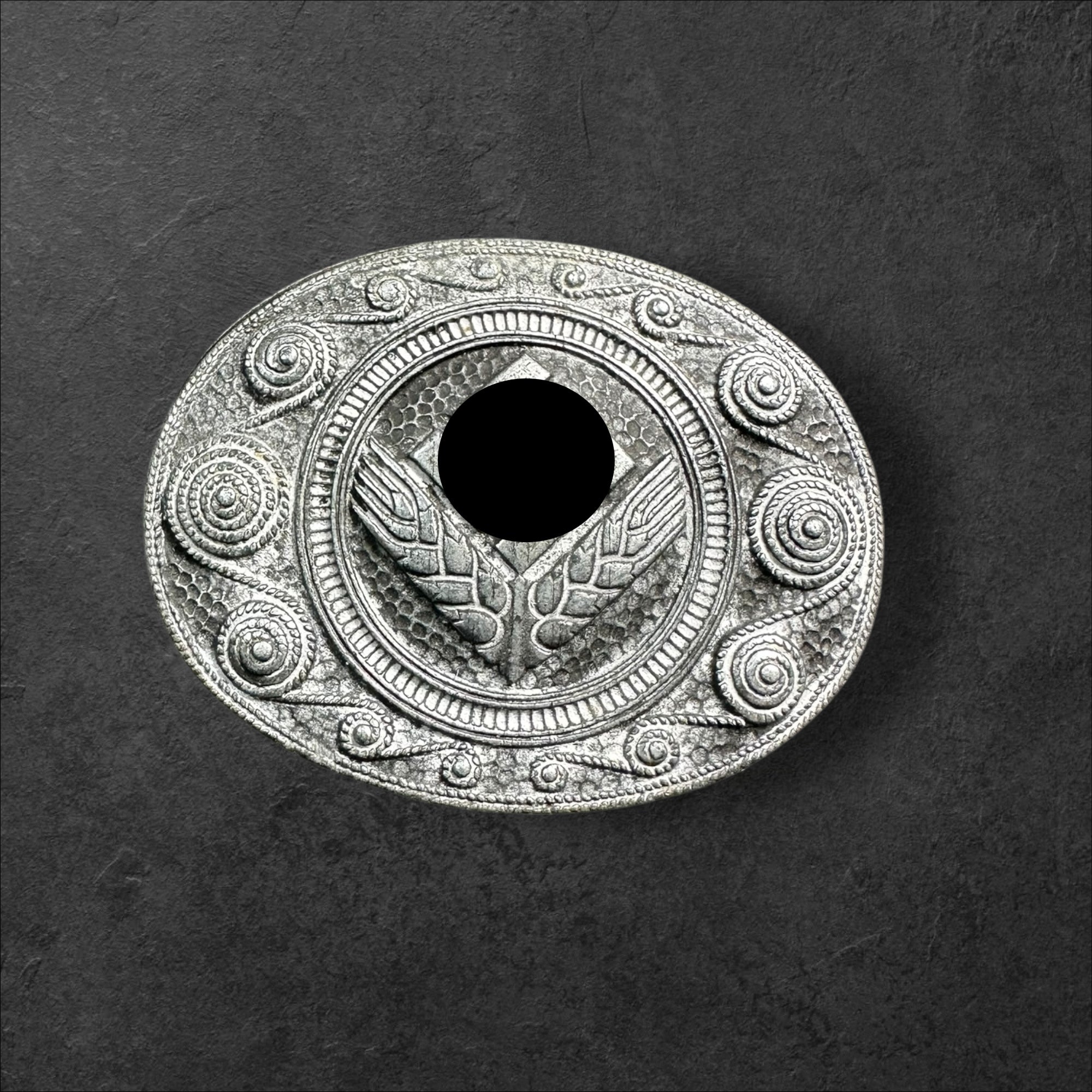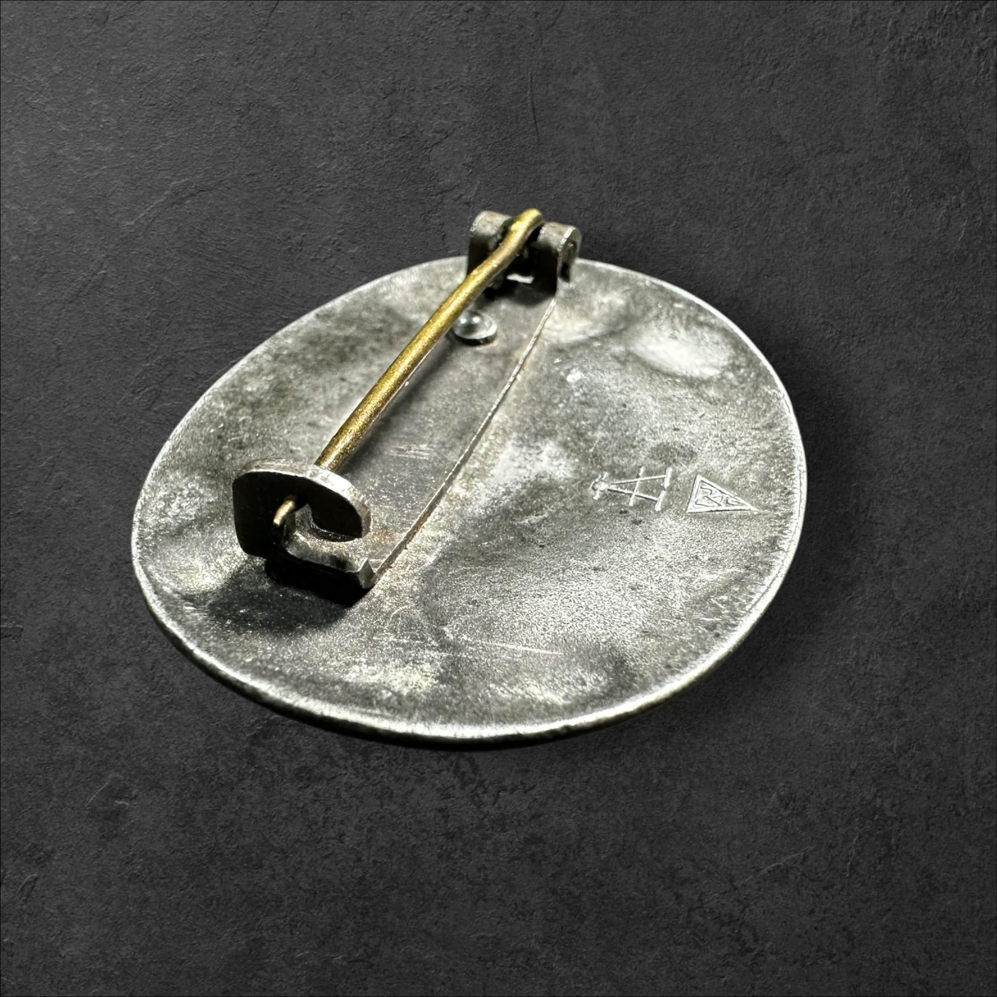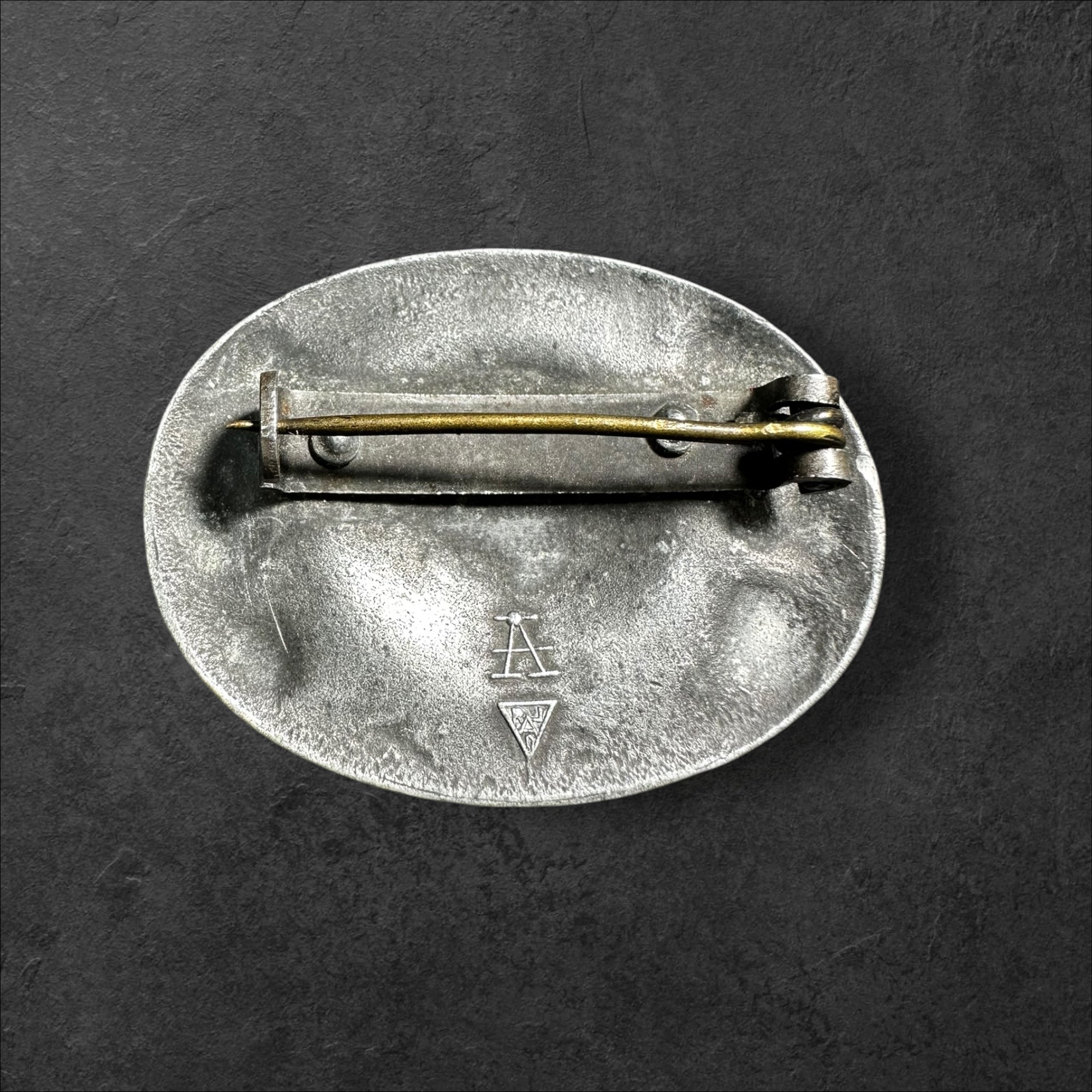 Eine gut erhaltene Brosche aus Feinzink mit rückseitiger Markierung des Herstellers F.W. Assmann & Söhne, Lüdenscheid