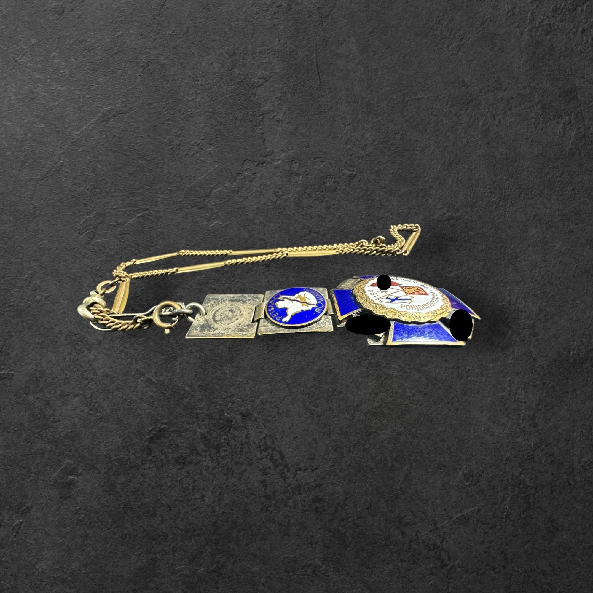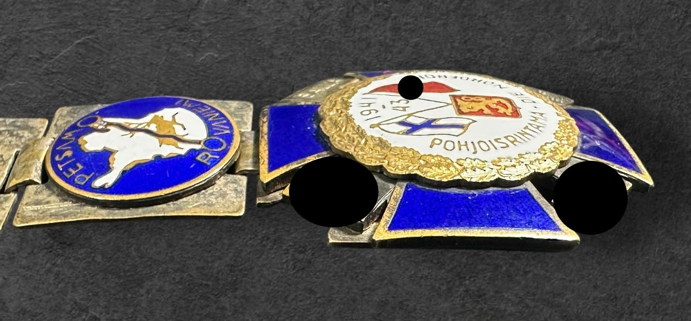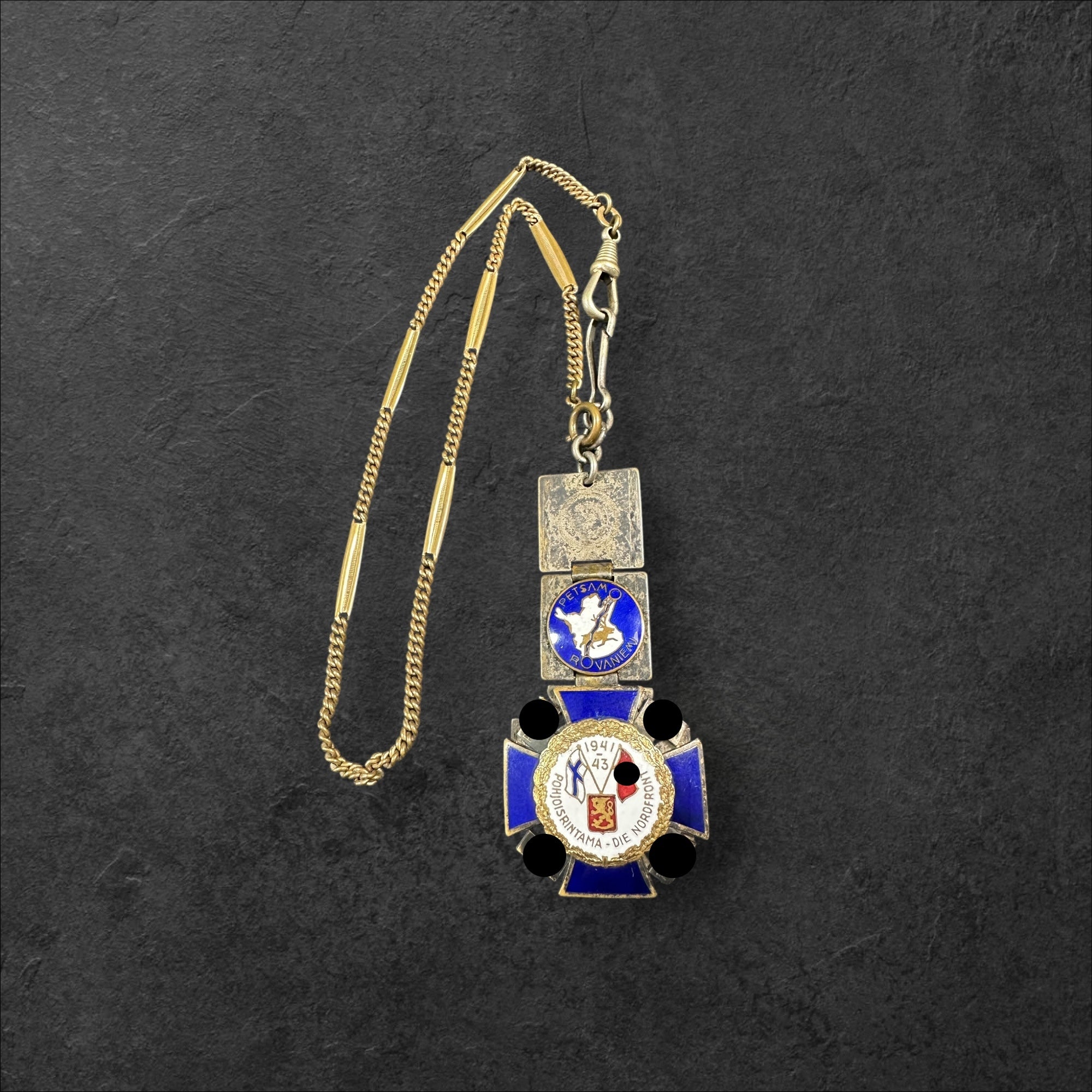 Ein gut erhaltenes Nordfrontkreuz in der Ausführung 1941-43 und dem Petsamo-Rovaniemi Abzeichen. Beides auf einem extra angefertigtem Anhänger, bestehend aus 3 verzierten Plättchen und einer Frackkette. Die Orden sind durch eine Loch an die Montage geschraubt. Ein tolles, ausdruckstarkes Set
