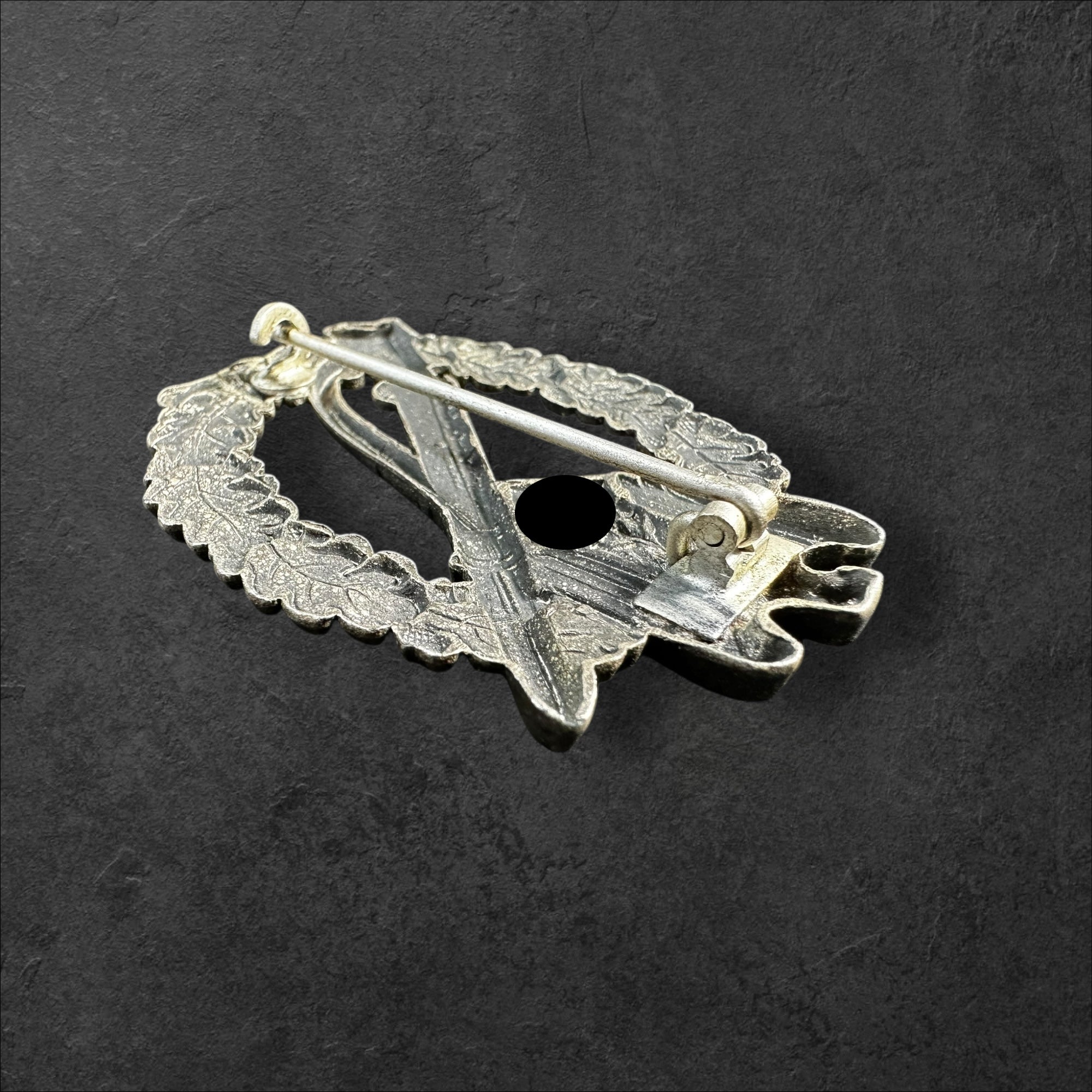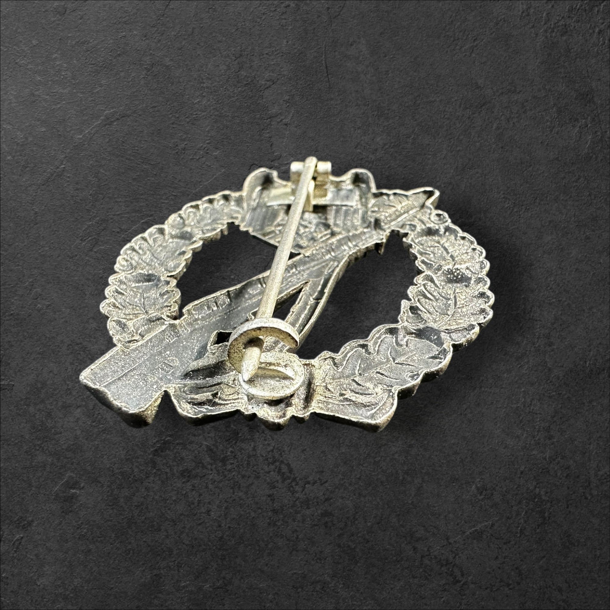 Ein ehrlich getragenes Infanteriesturmabzeichen aus hohlgeprägtem Feinzink. Ohne Herstellermarkierung jedoch eine sichere Variante der Firma Hymmen & Co., Lüdenscheid