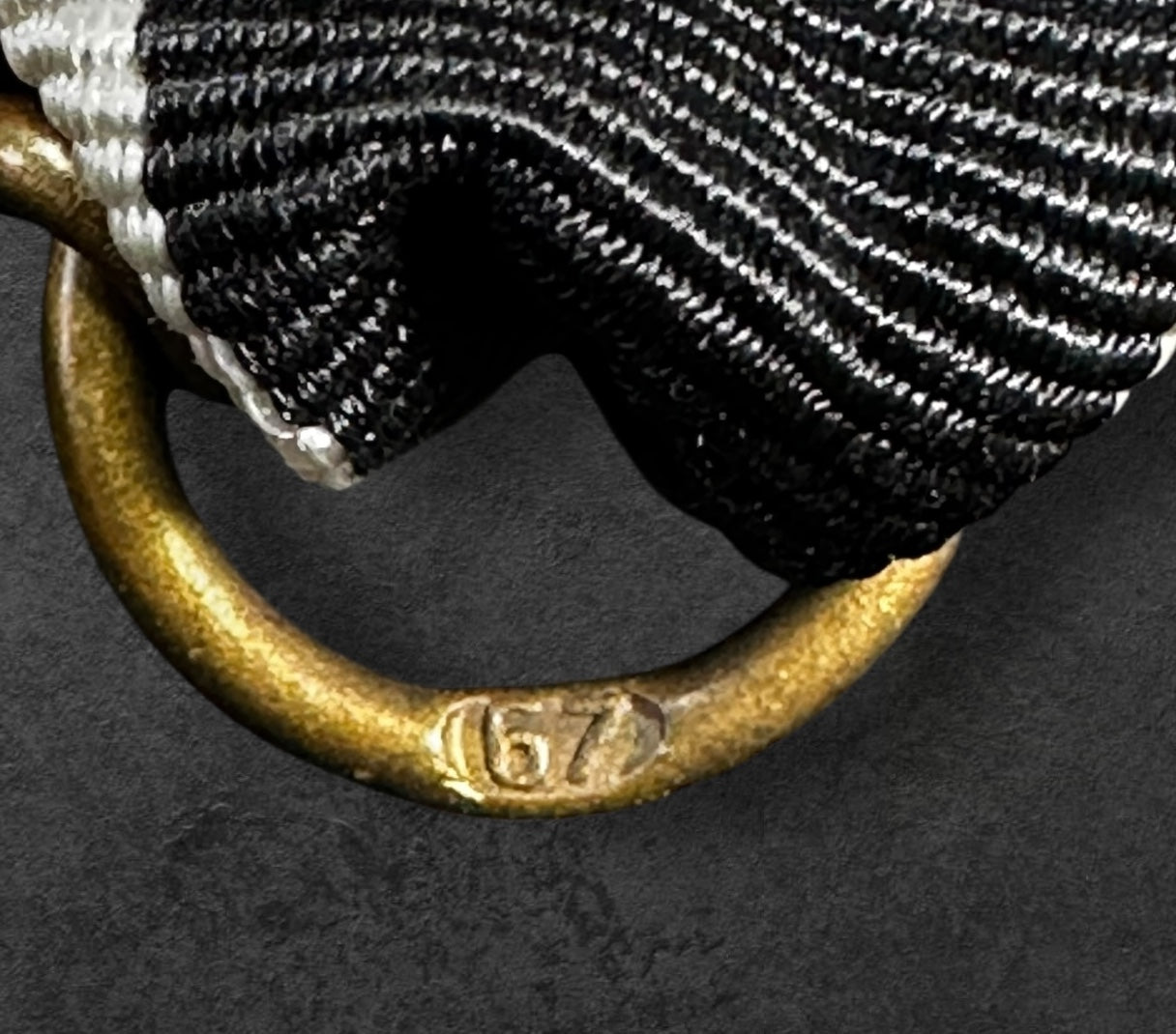 Sehr gut erhaltenes Kreuz mit Herstellermarkierung 67 (H. Kreisel, Gablonz) am langen Band