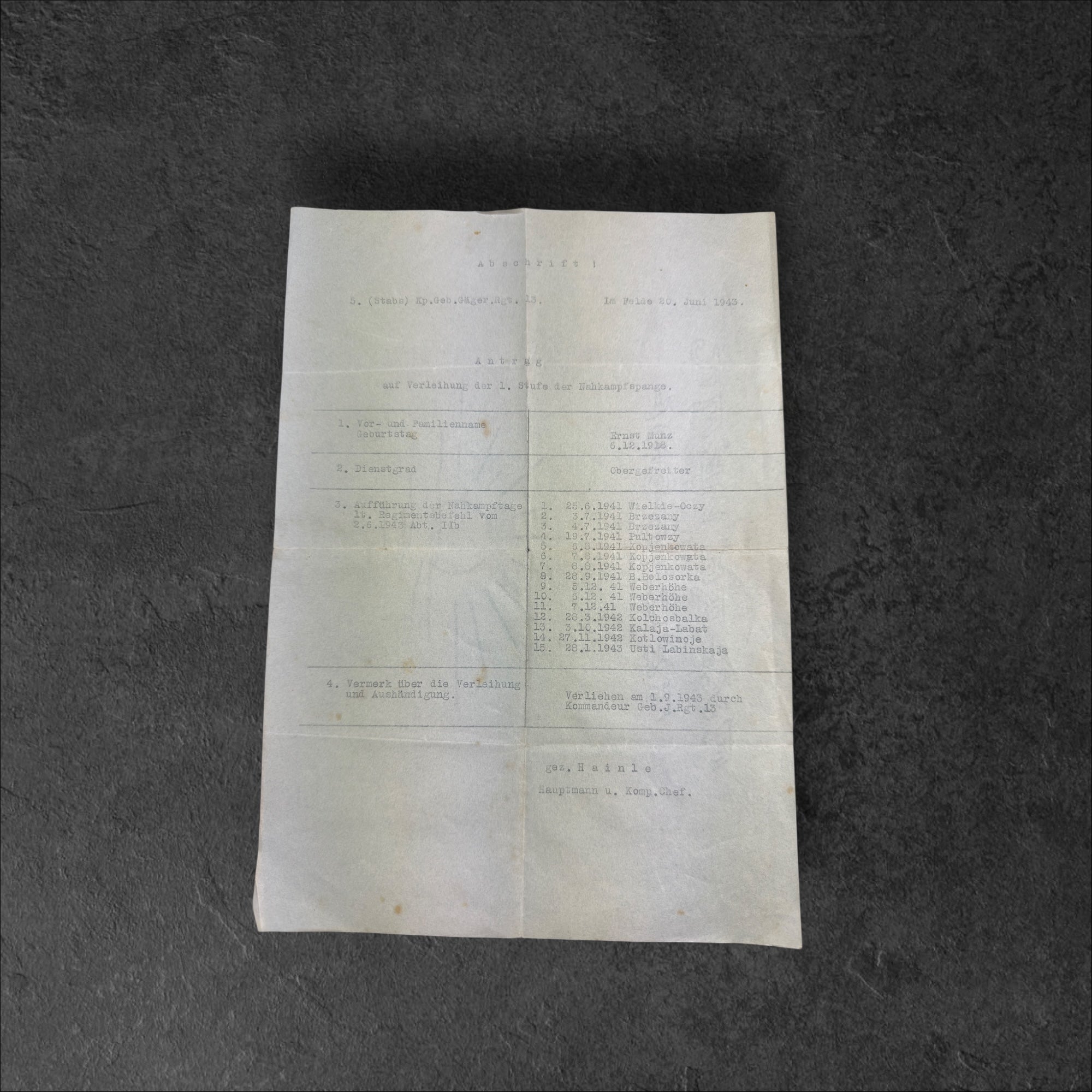 -Nahkampfspange 1.Stufe mit VB (1.9.1943 Oberst Johann Buchner, DKiG)