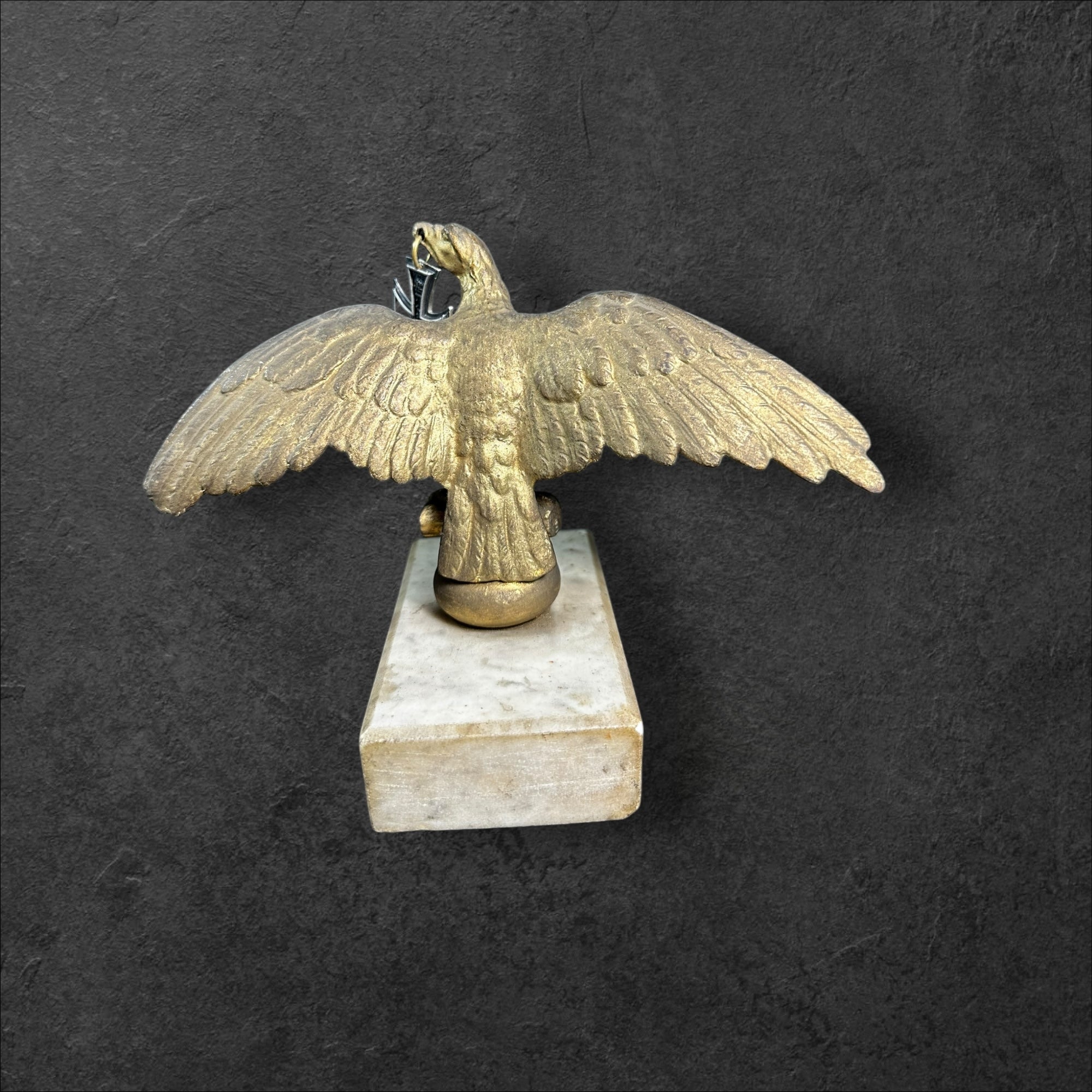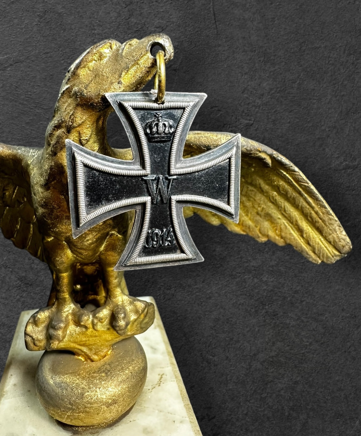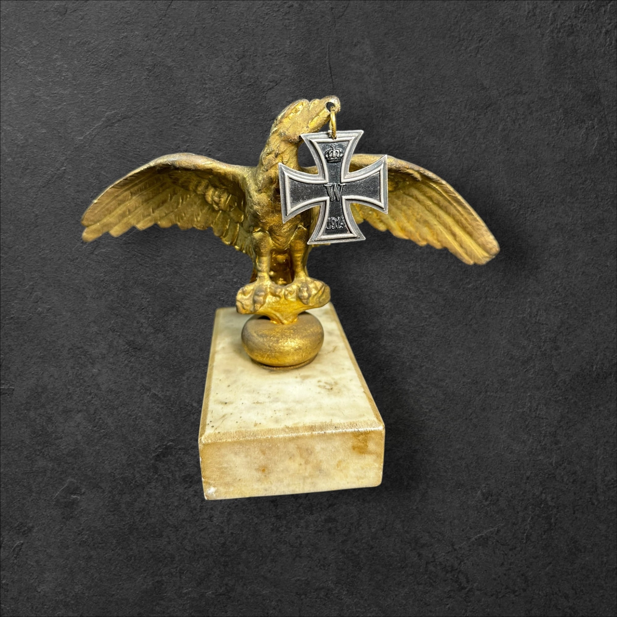 Ein Metalladler mit ausgebreiteten Schwingen auf einem Marmorsockel, im Schnabel ein Ring mit einem Eisernen Kreuz 2.Klasse 1914/18