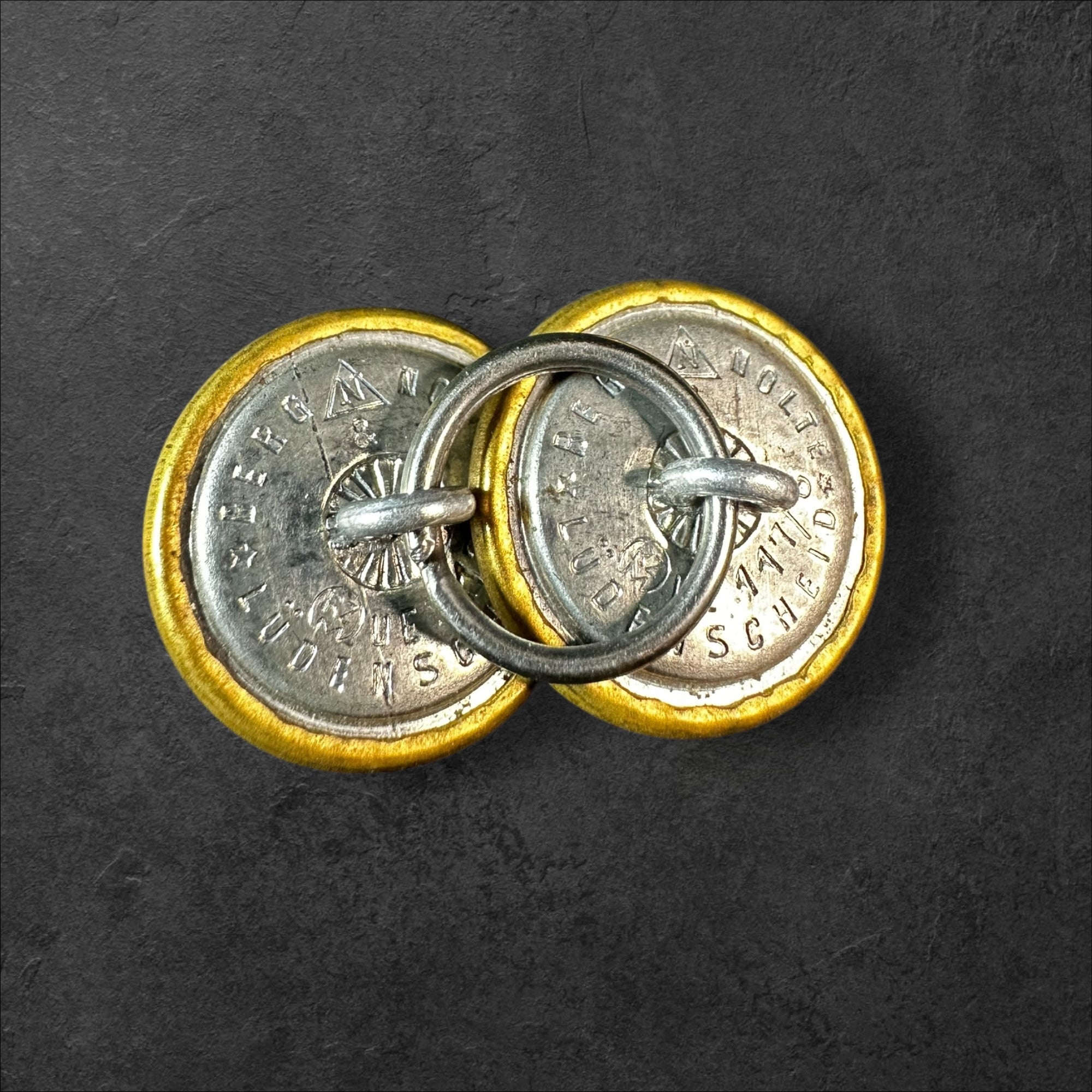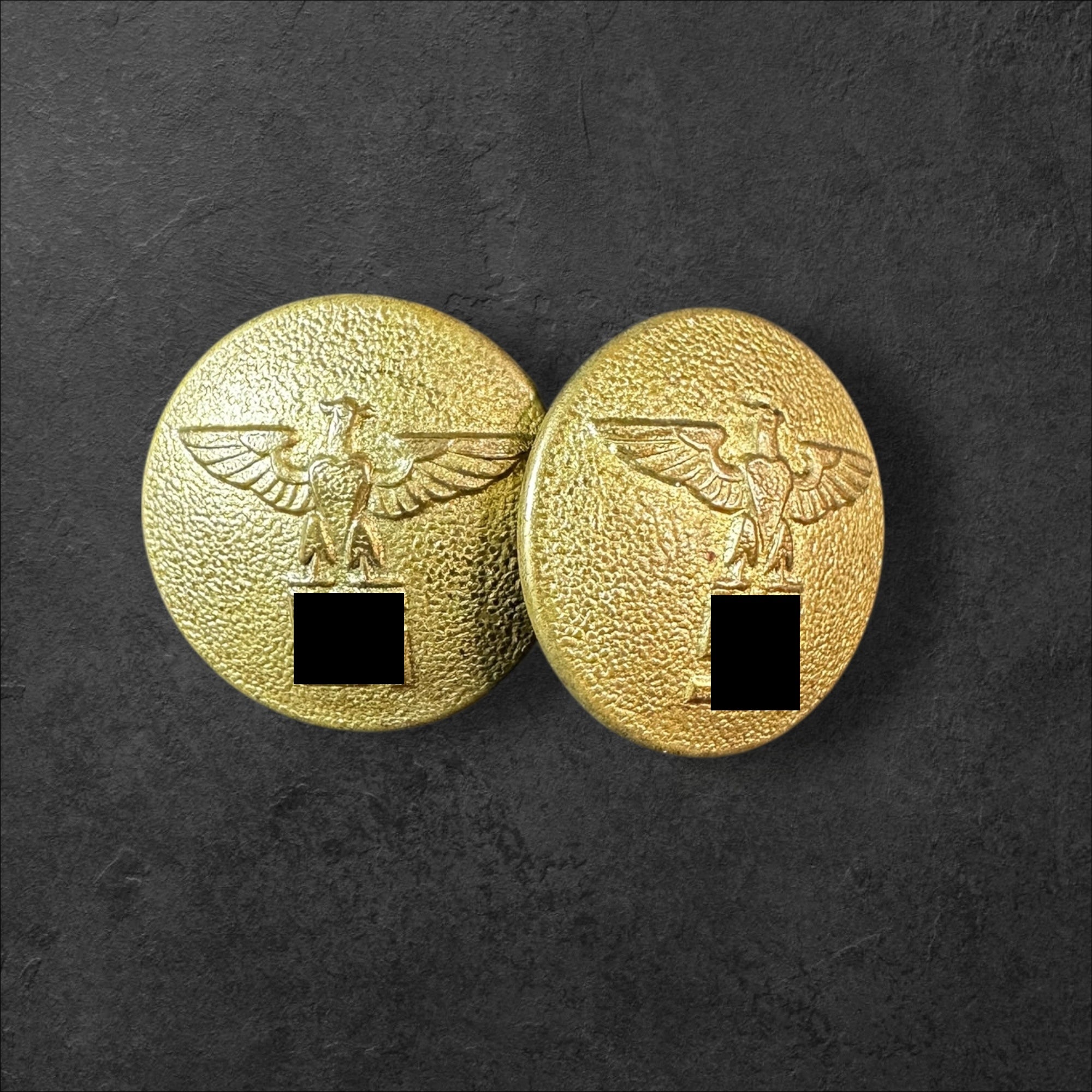 Zwei goldene Uniformknöpfe für einen politischen Leiter der NSDAP, rückseitig mit Markierung des Herstellers Berg und Nolte, Lüdenscheid