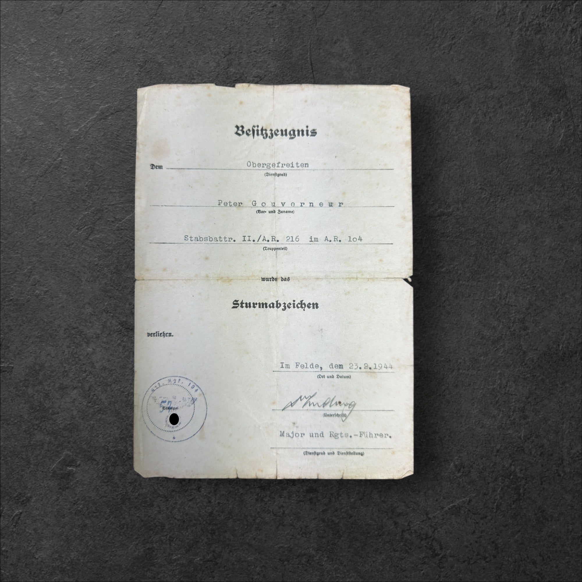 -Besitzzeugnis Sturmabzeichen 23.02.1944 (Unterschrift Fritz Ludwig, DKiG)