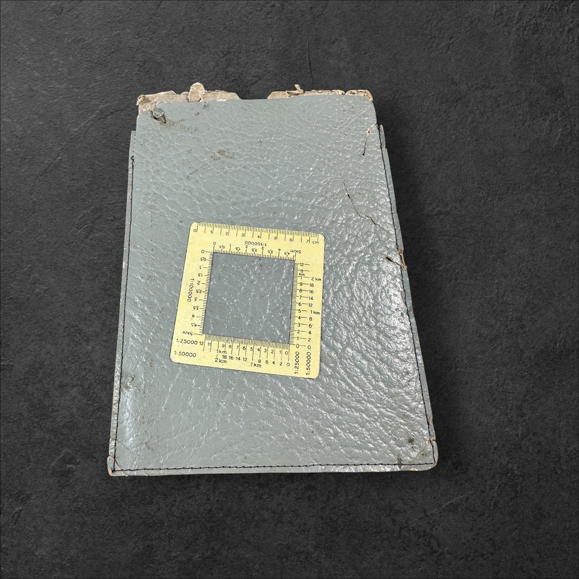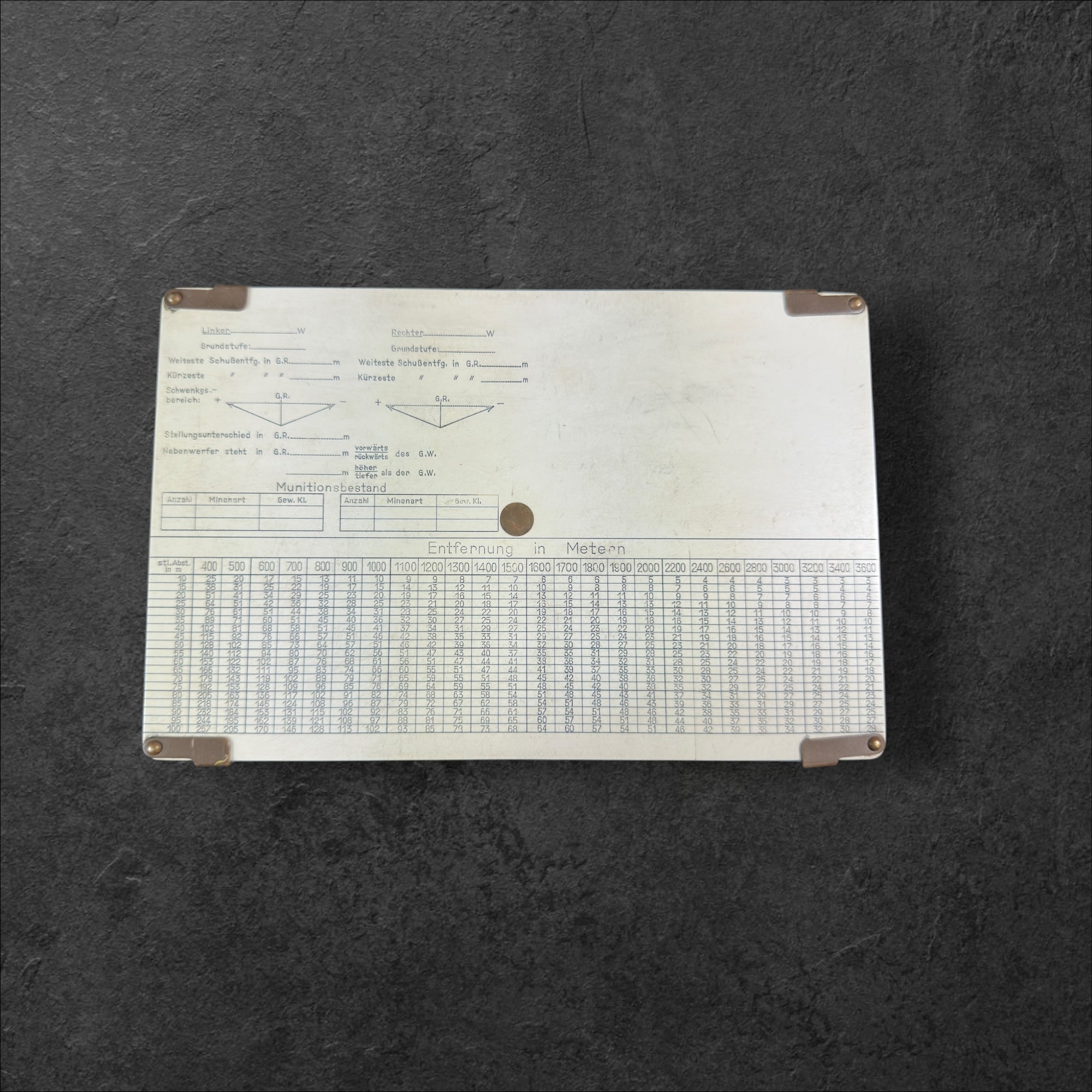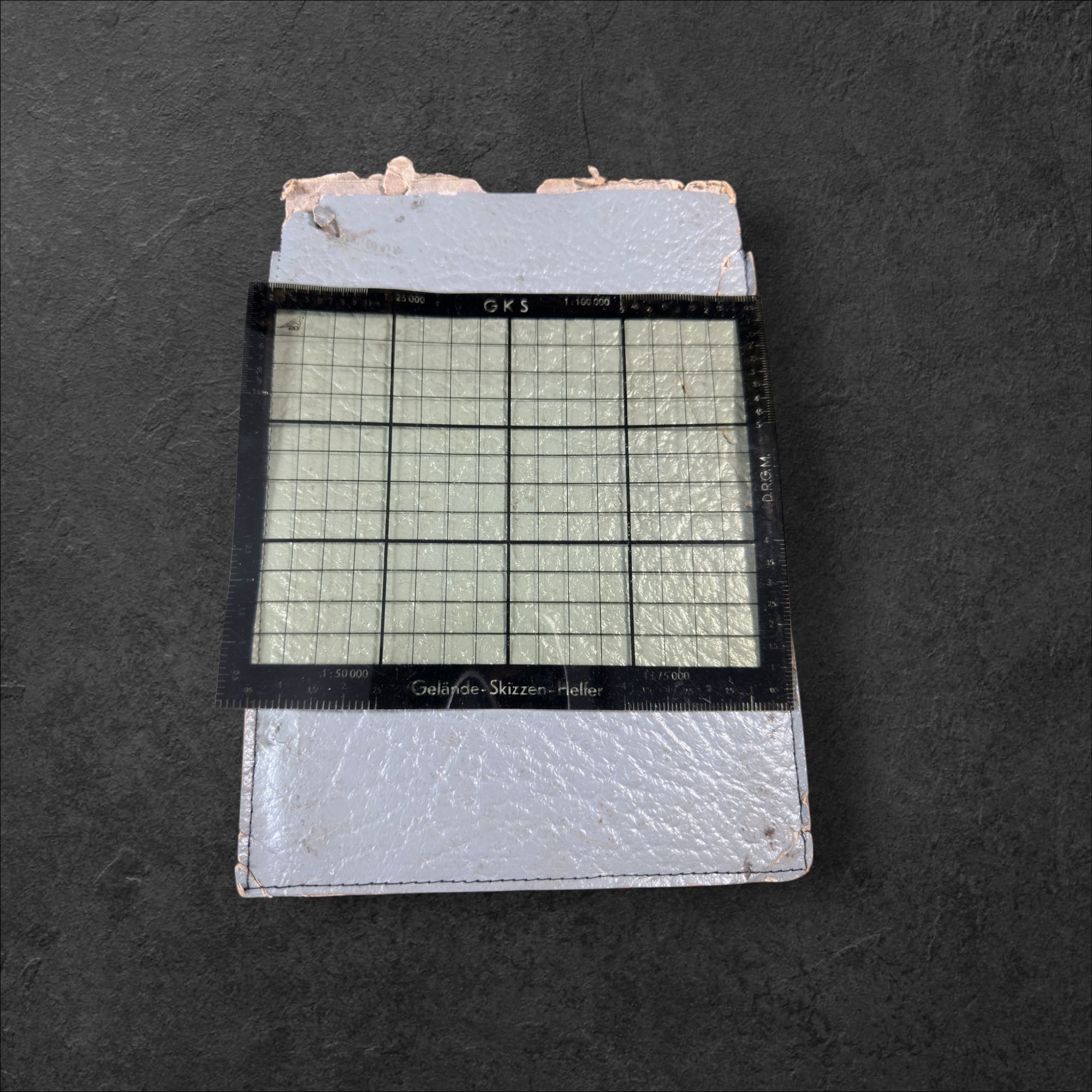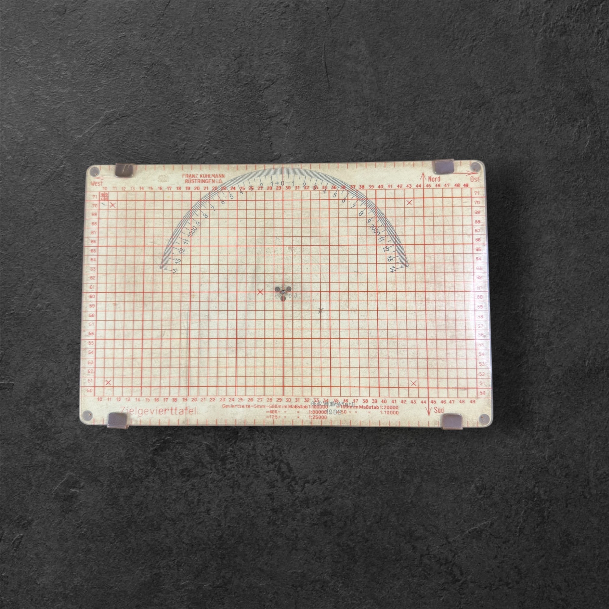 Eine gut erhaltene Zielgevierttafel mit Planzeiger und Gelände-Skizzen-Helfer, alles in einer Art Schutzumschlag aus Presspappe.