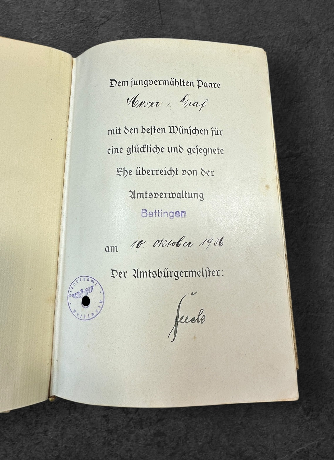 Eine sehr gut erhaltene Hochzeitsausgabe von 1936 mit Widmung der Stadt Bettingen, der Schuber leider defekt