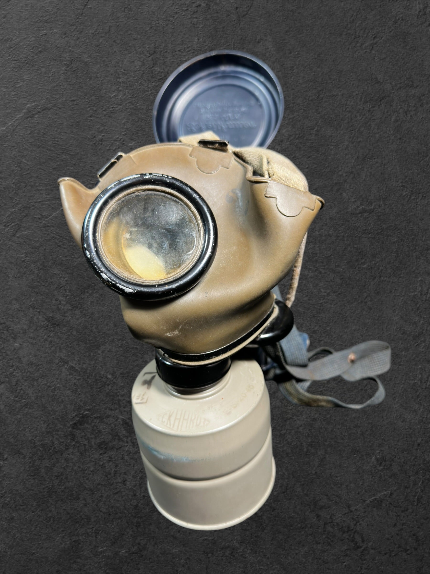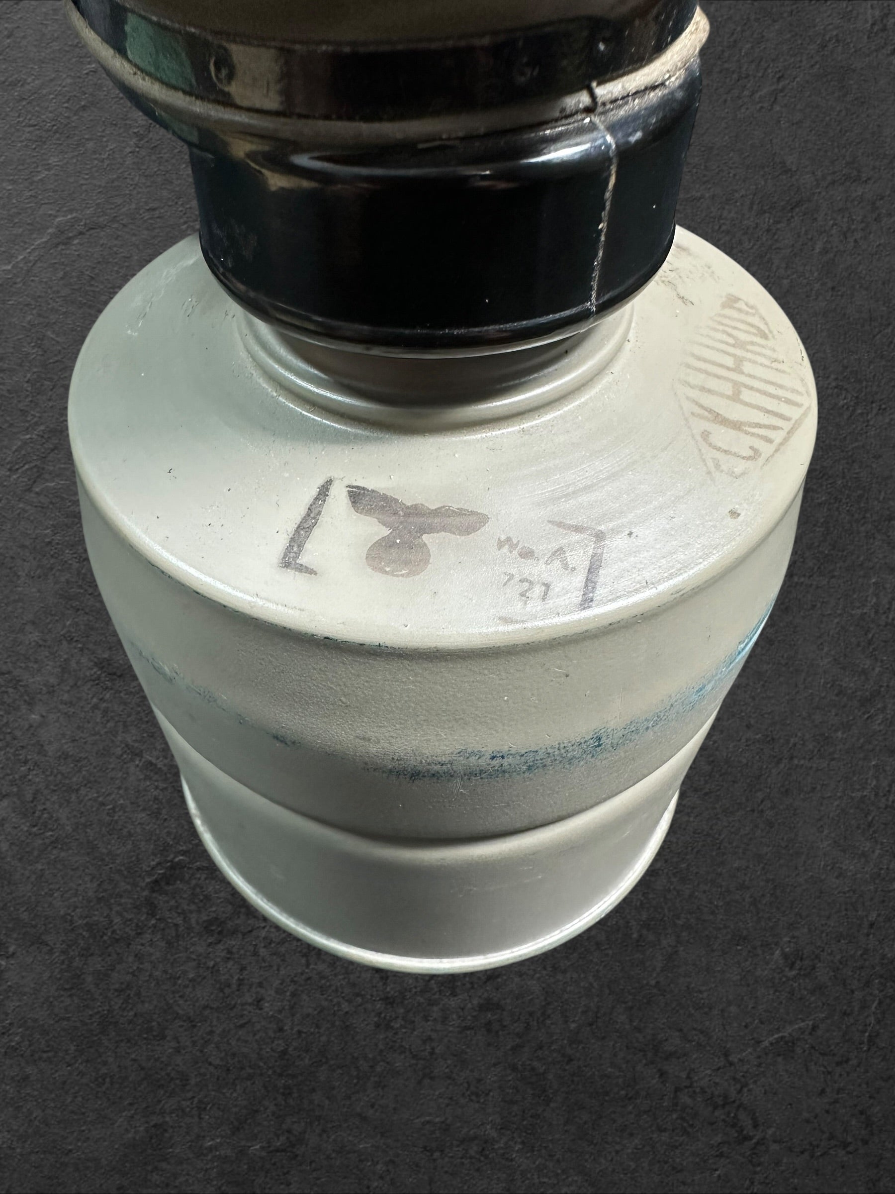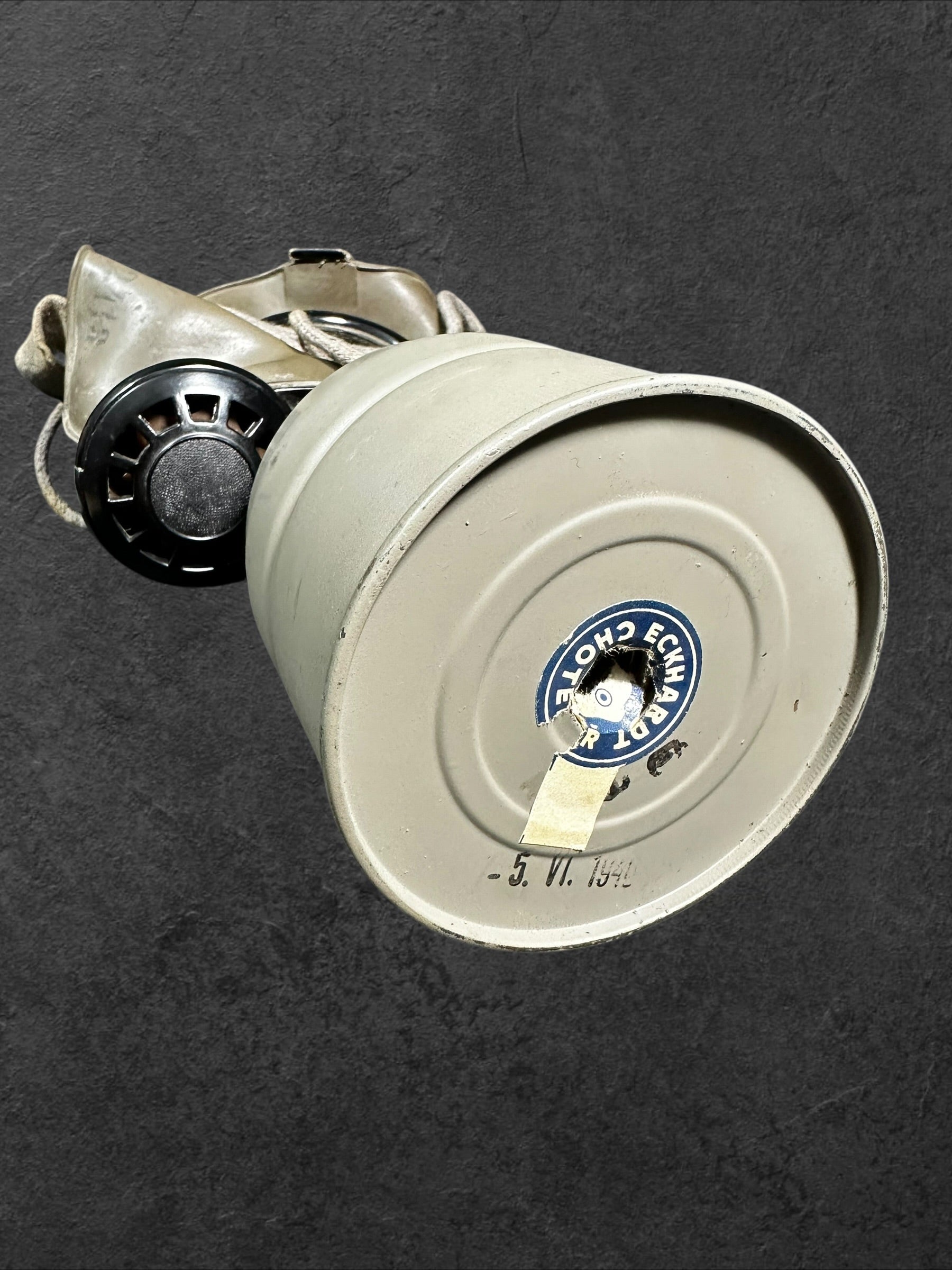 Eine selten zu findende Kombination aus einer Gasmaske aus tschechicher Produktion, deutschem "Eckhardt" Filter und Gasmaskenbüchse "Scheidthammer RL1 40/11. Ein tolles Stück im super Erhaltungszustand