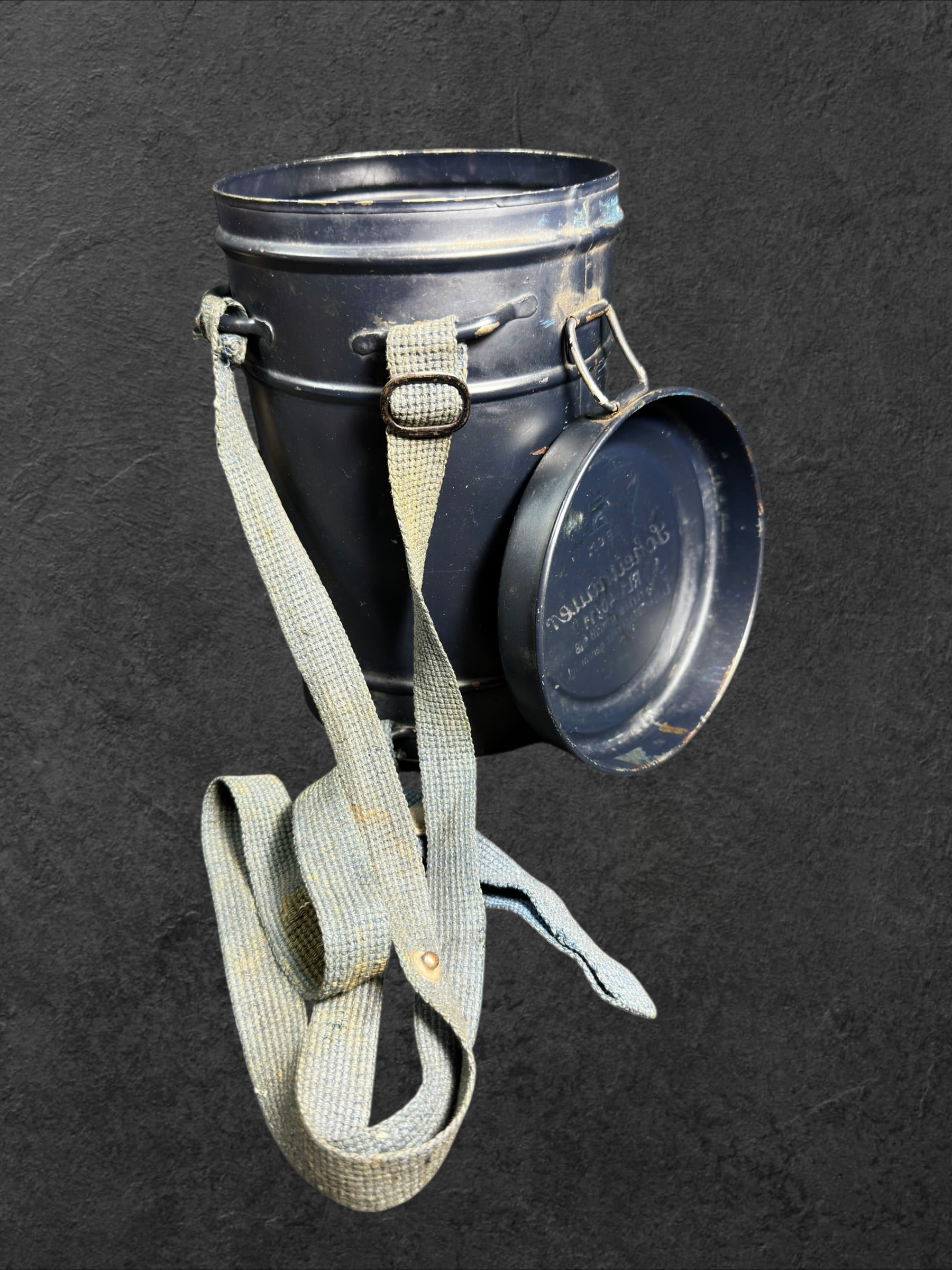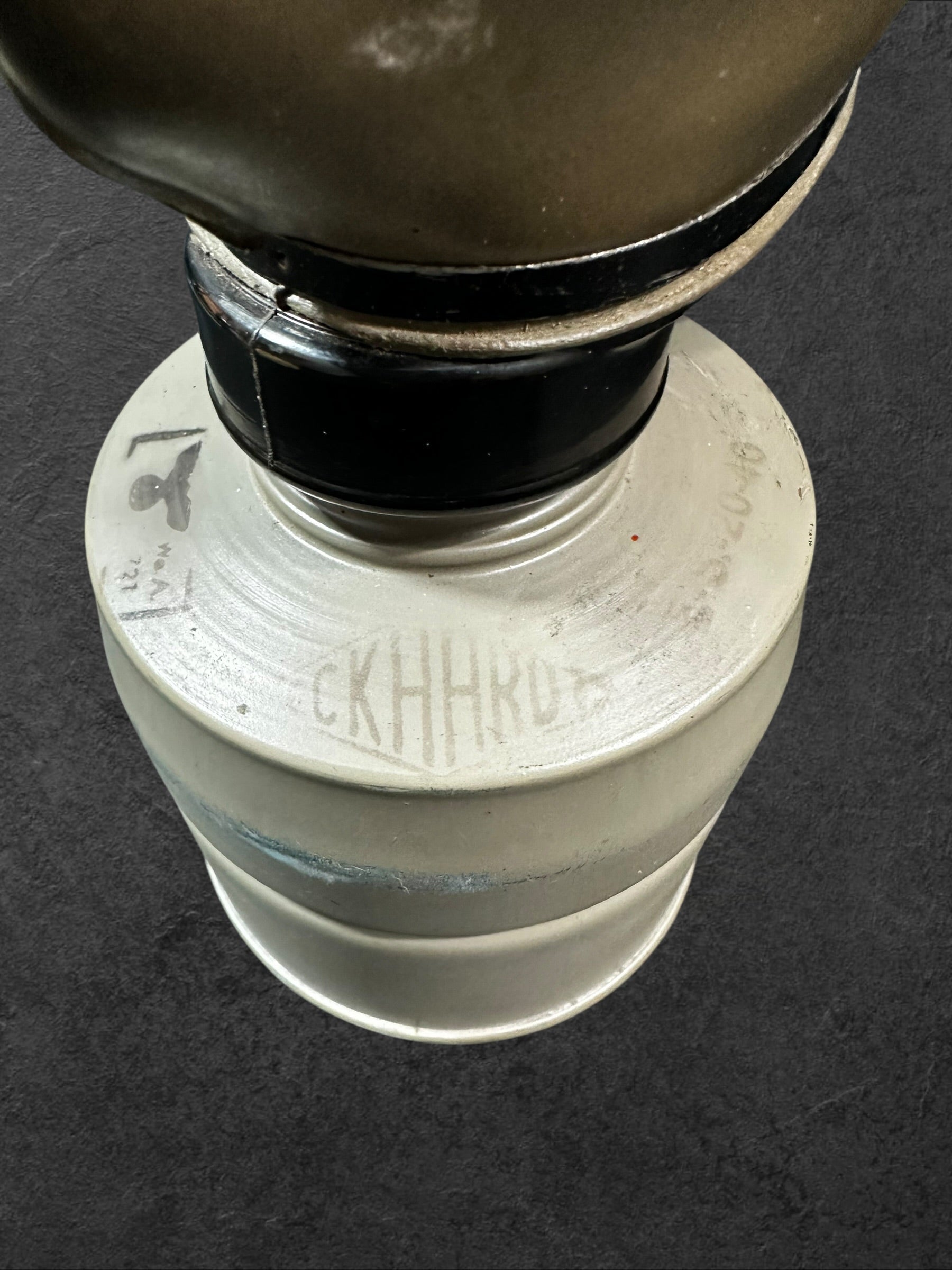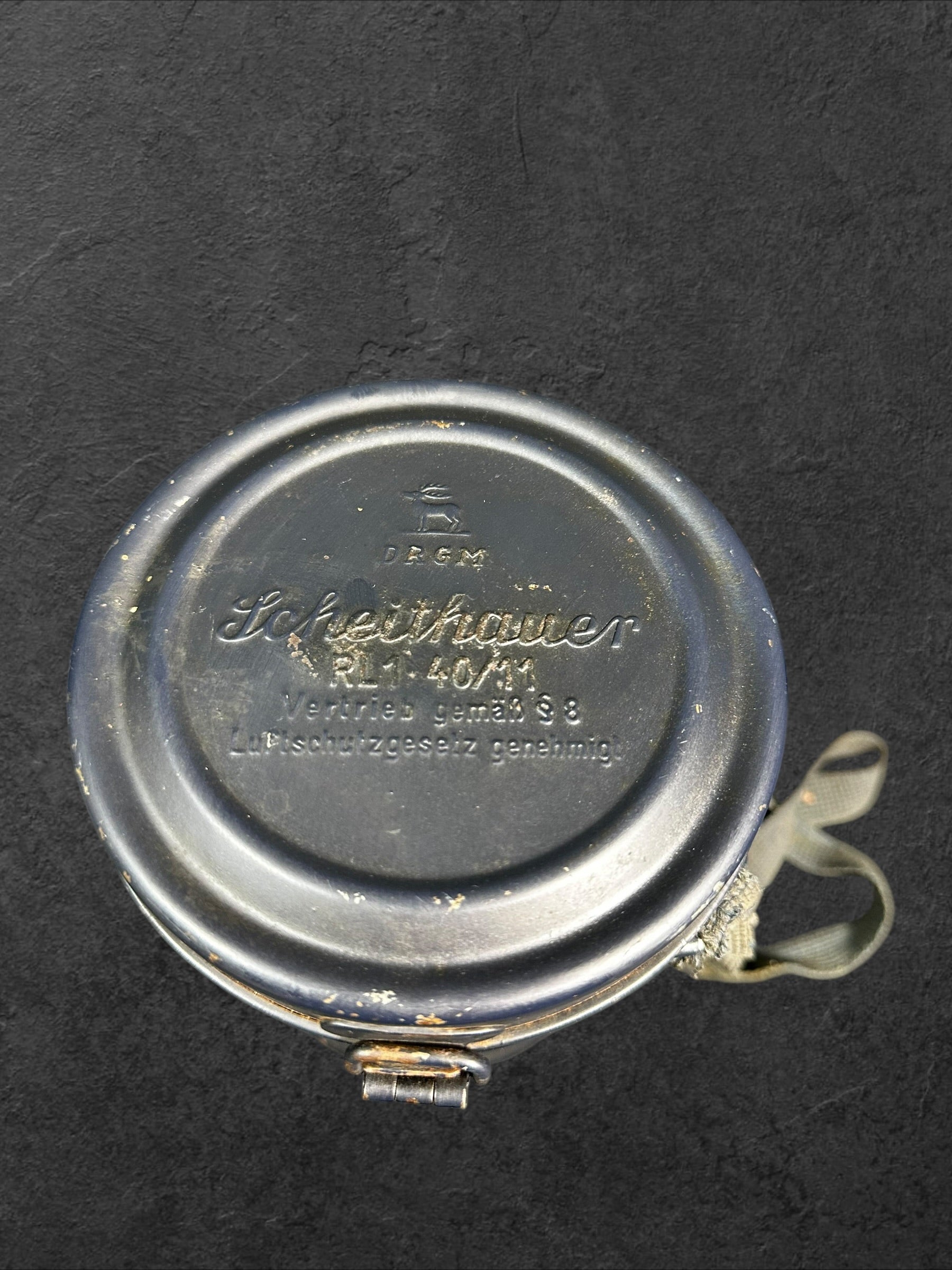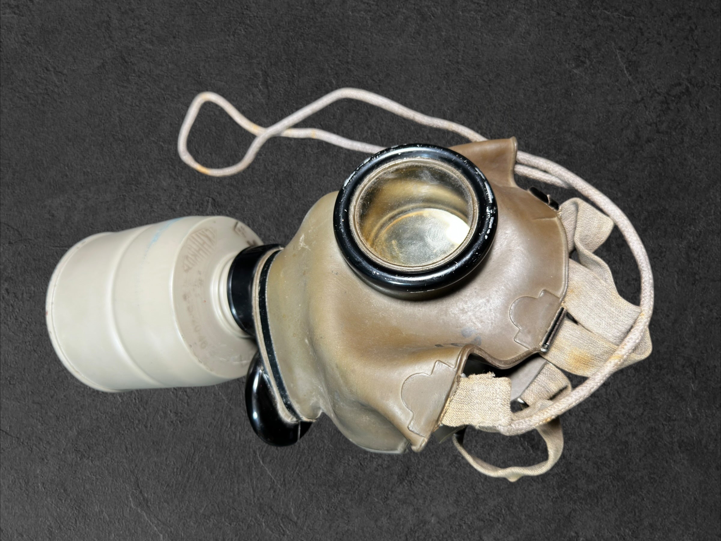 Eine selten zu findende Kombination aus einer Gasmaske aus tschechicher Produktion, deutschem "Eckhardt" Filter und Gasmaskenbüchse "Scheidthammer RL1 40/11. Ein tolles Stück im super Erhaltungszustand
