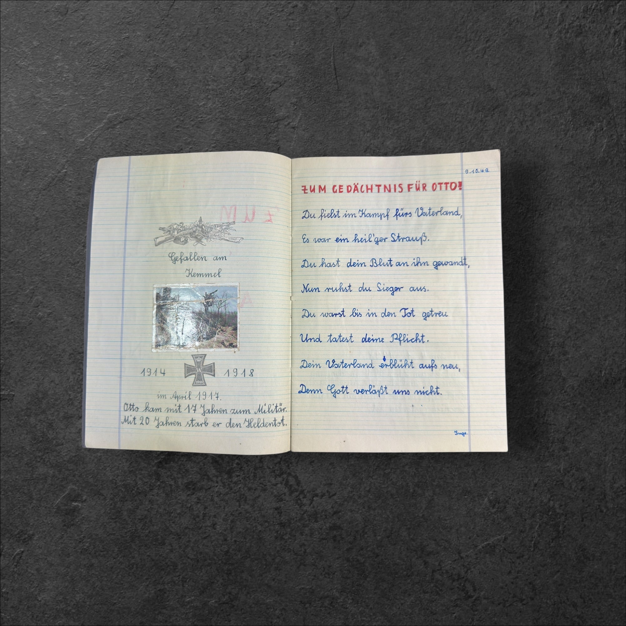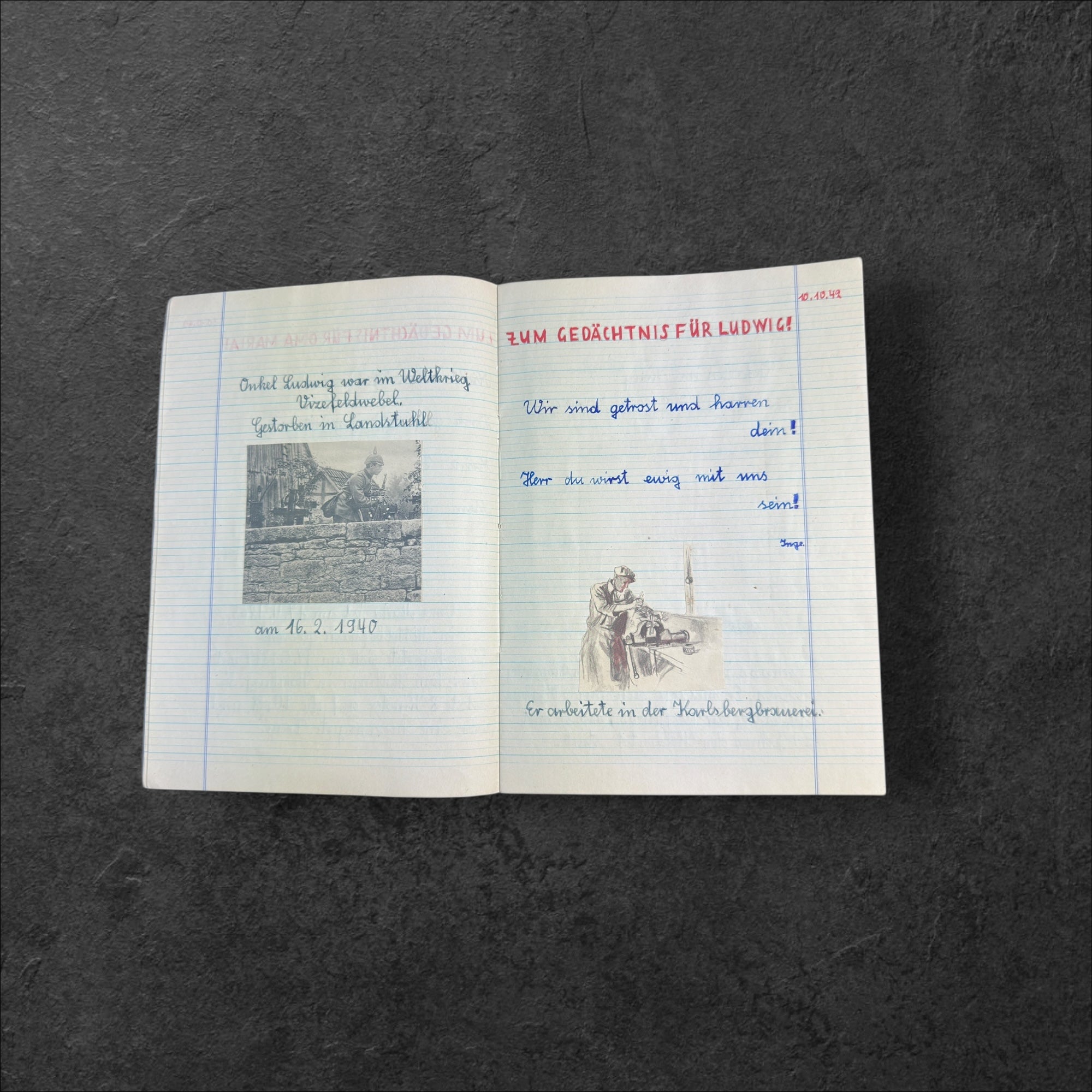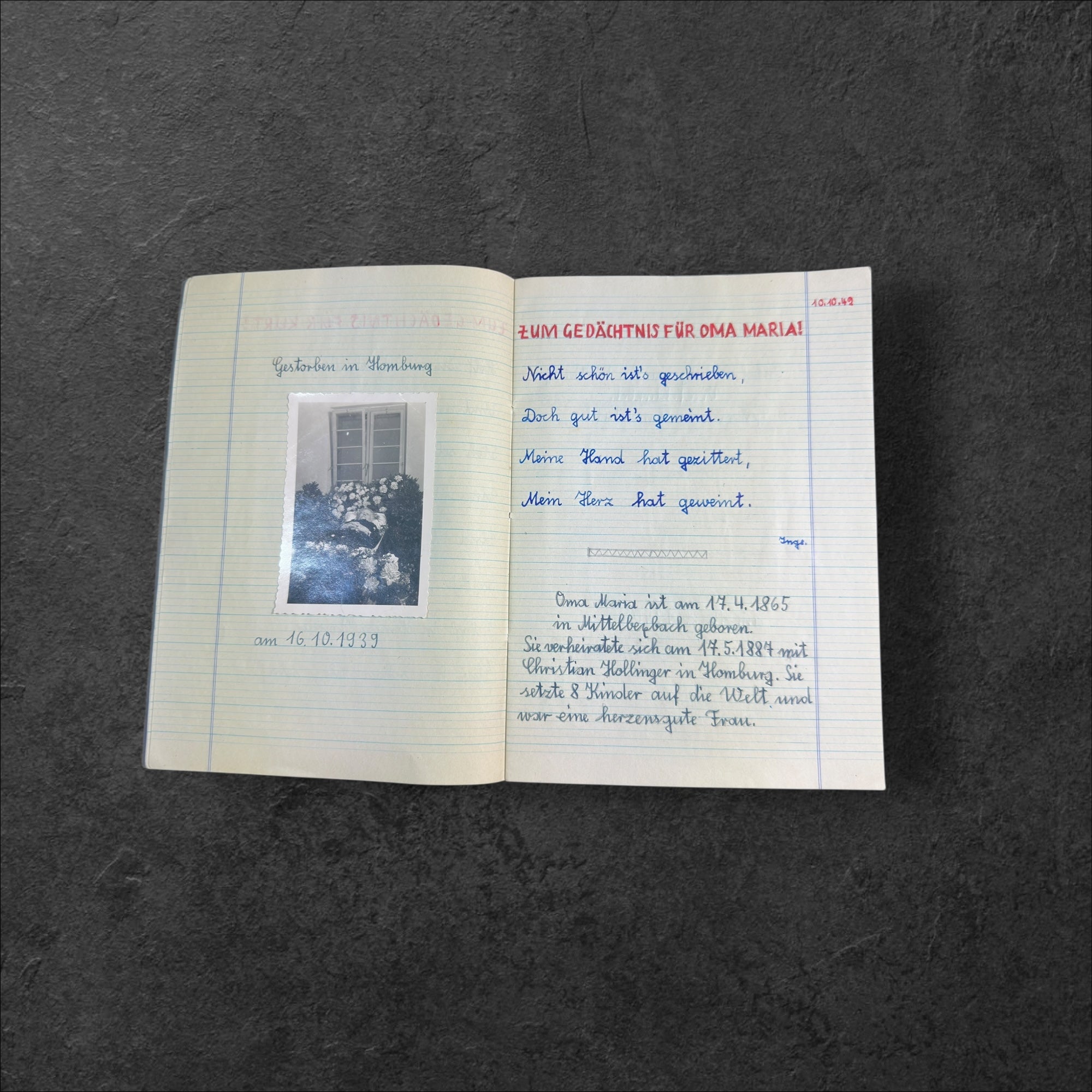 Schreibheft eines jungen Mädchen welches auf mehreren Seiten den Toten ihrer Familie ein Andenken schaffte