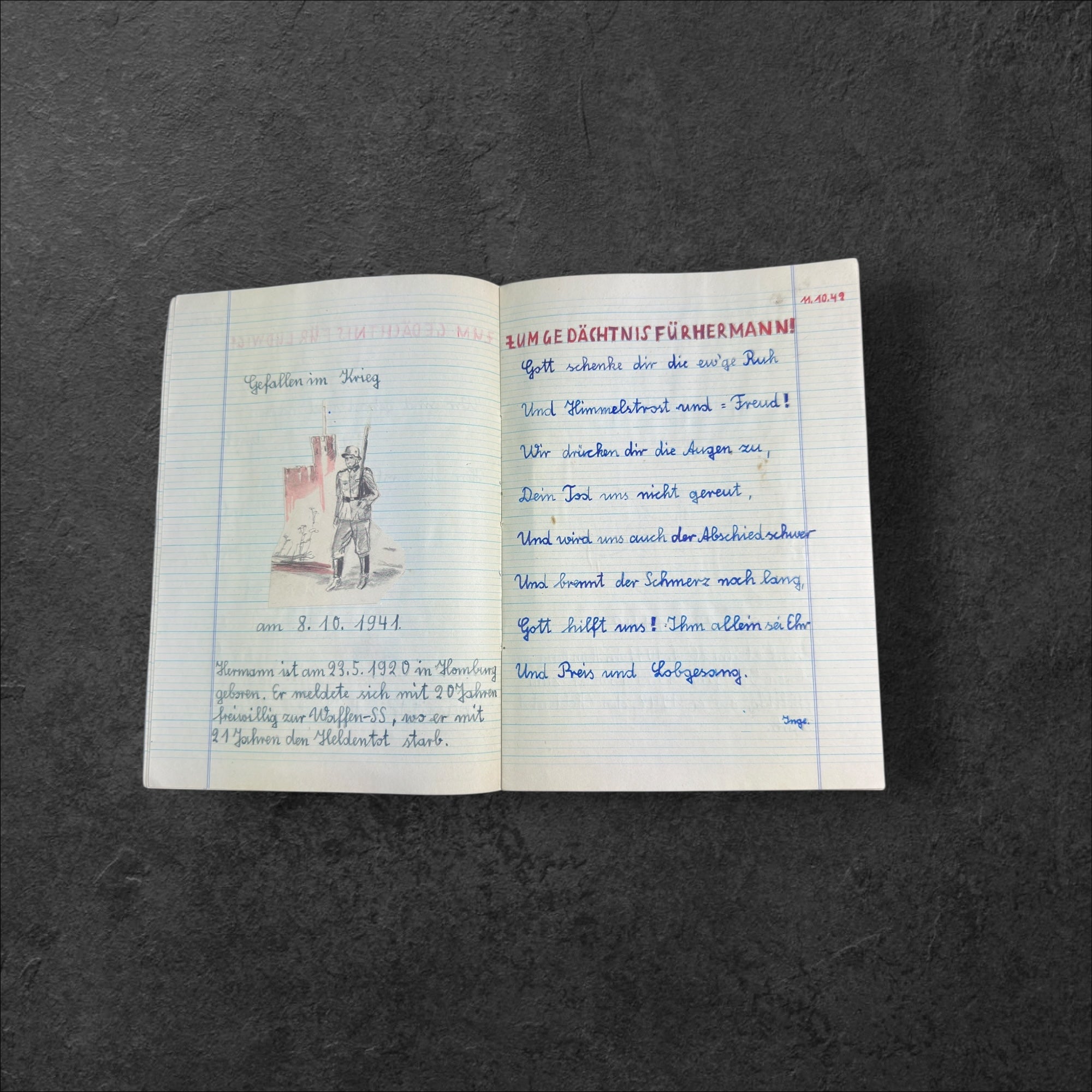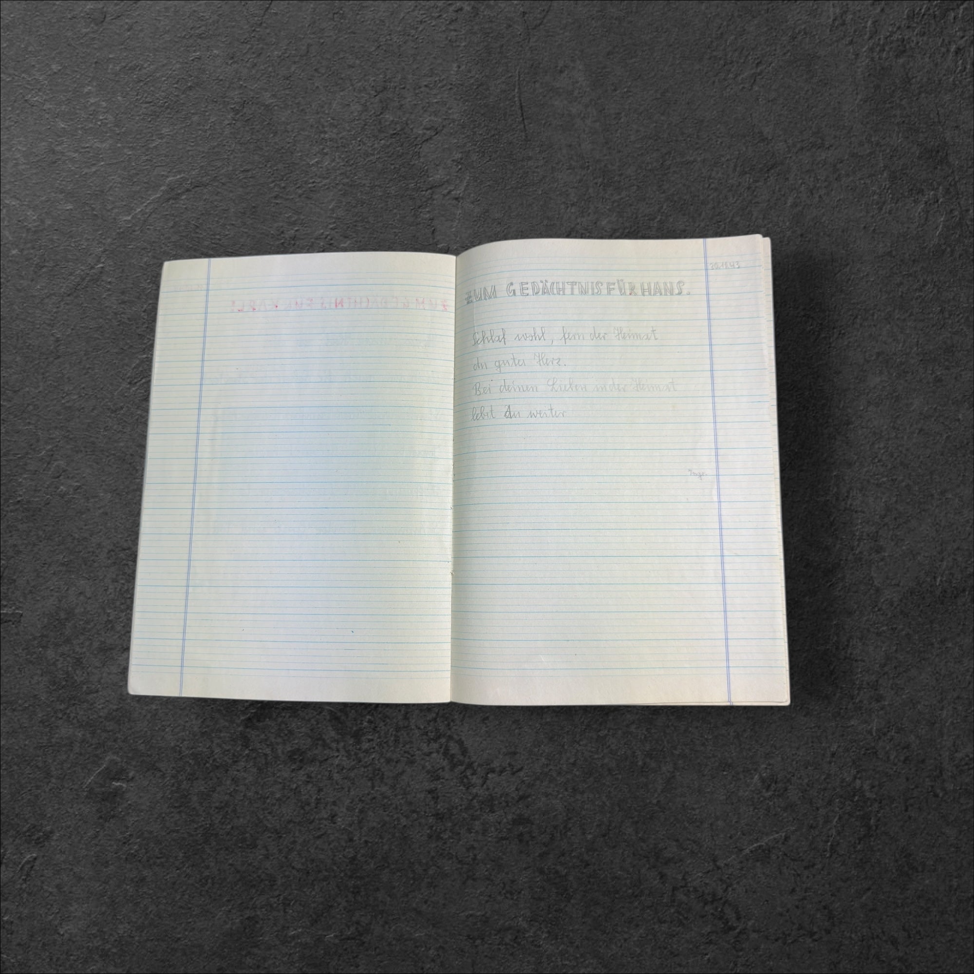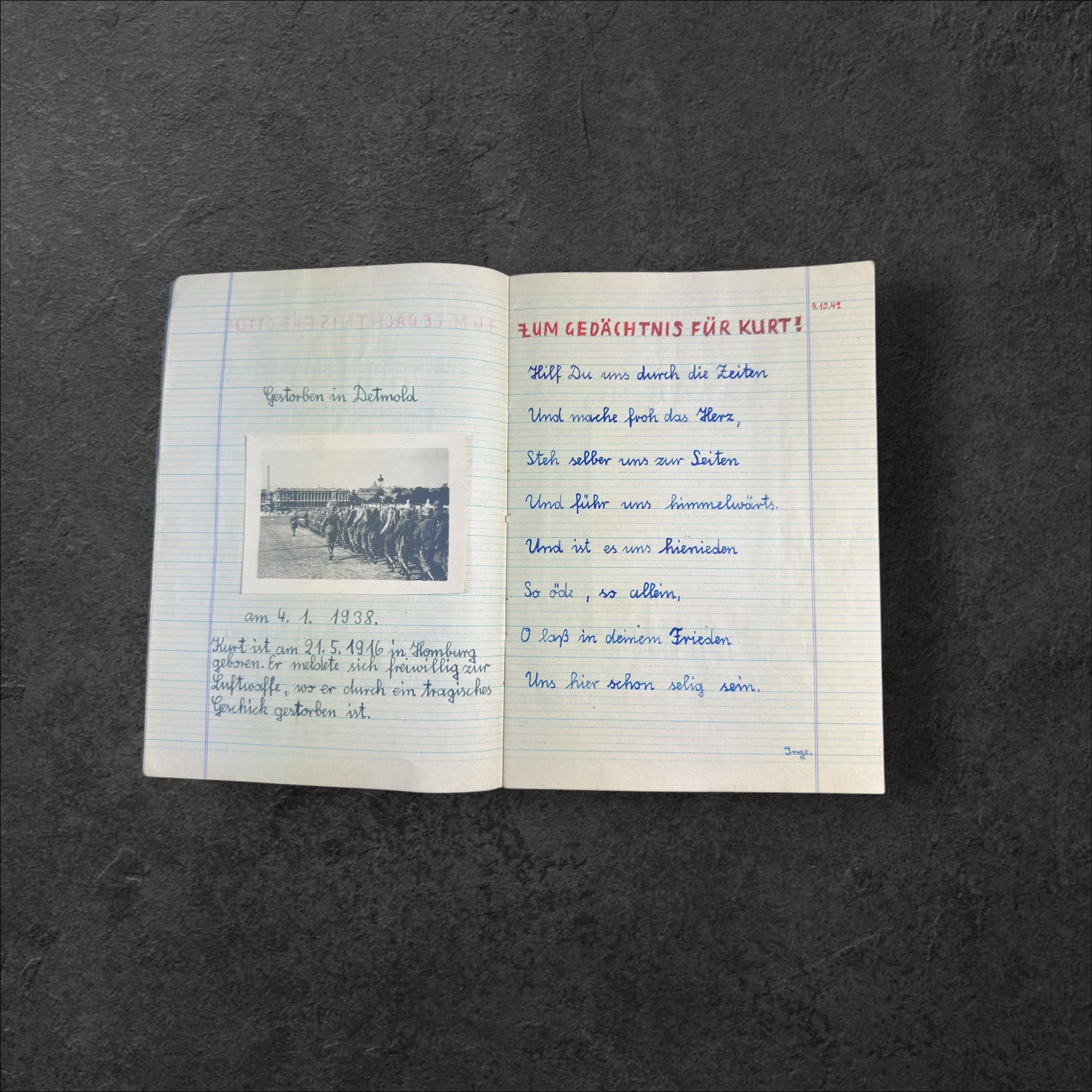 Schreibheft eines jungen Mädchen welches auf mehreren Seiten den Toten ihrer Familie ein Andenken schaffte