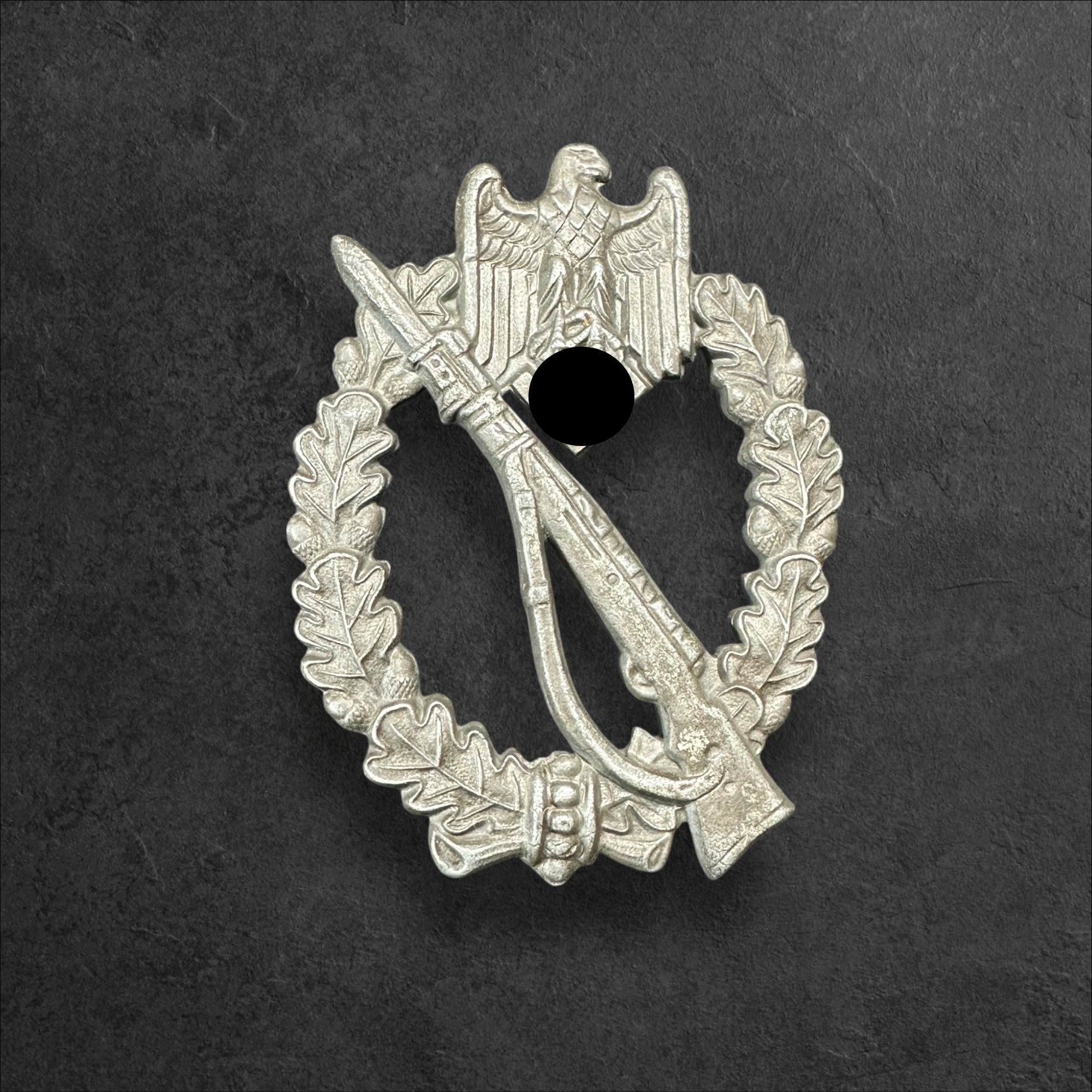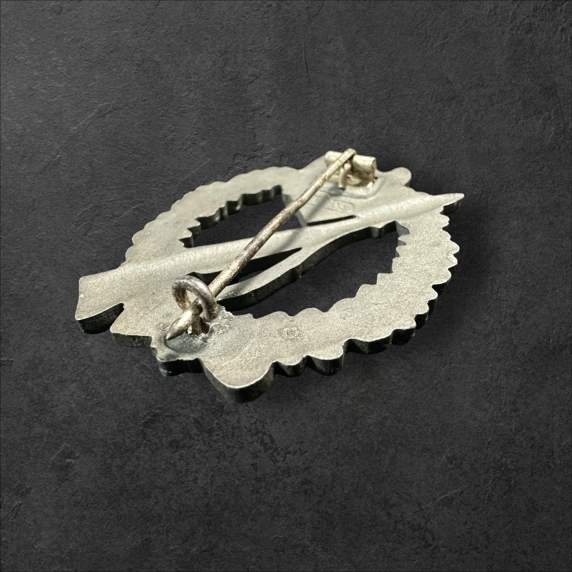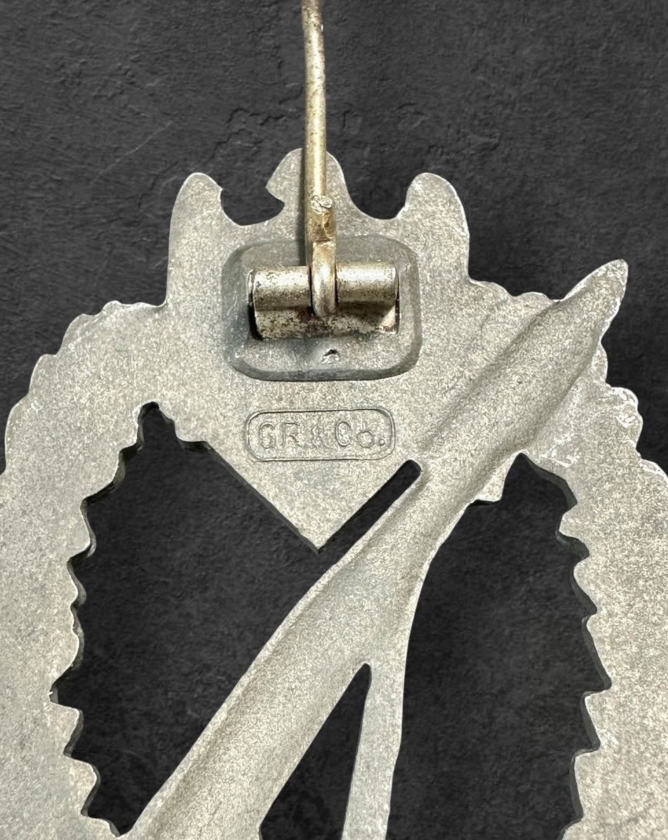 Ein ehrlich getragenes Infanteriesturmabzeichen in silber aus Feinzink mit rückseitiger Markierung "GR.&Co." des Herstellers Grossmann und Co, Wien. Die Versilberung leider vergangen, dennoch nicht so häufig zu finden