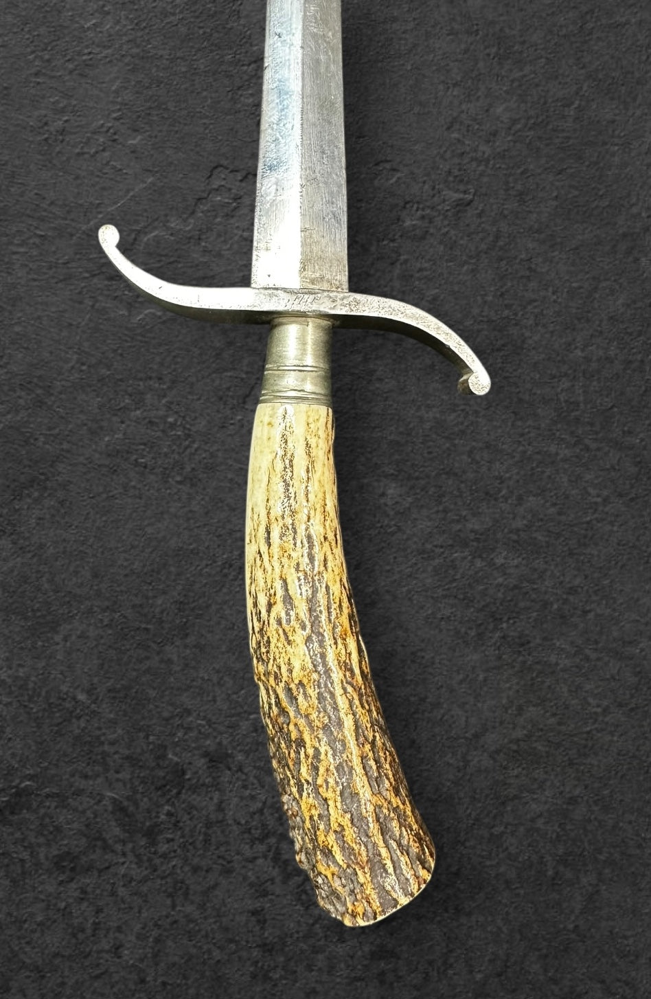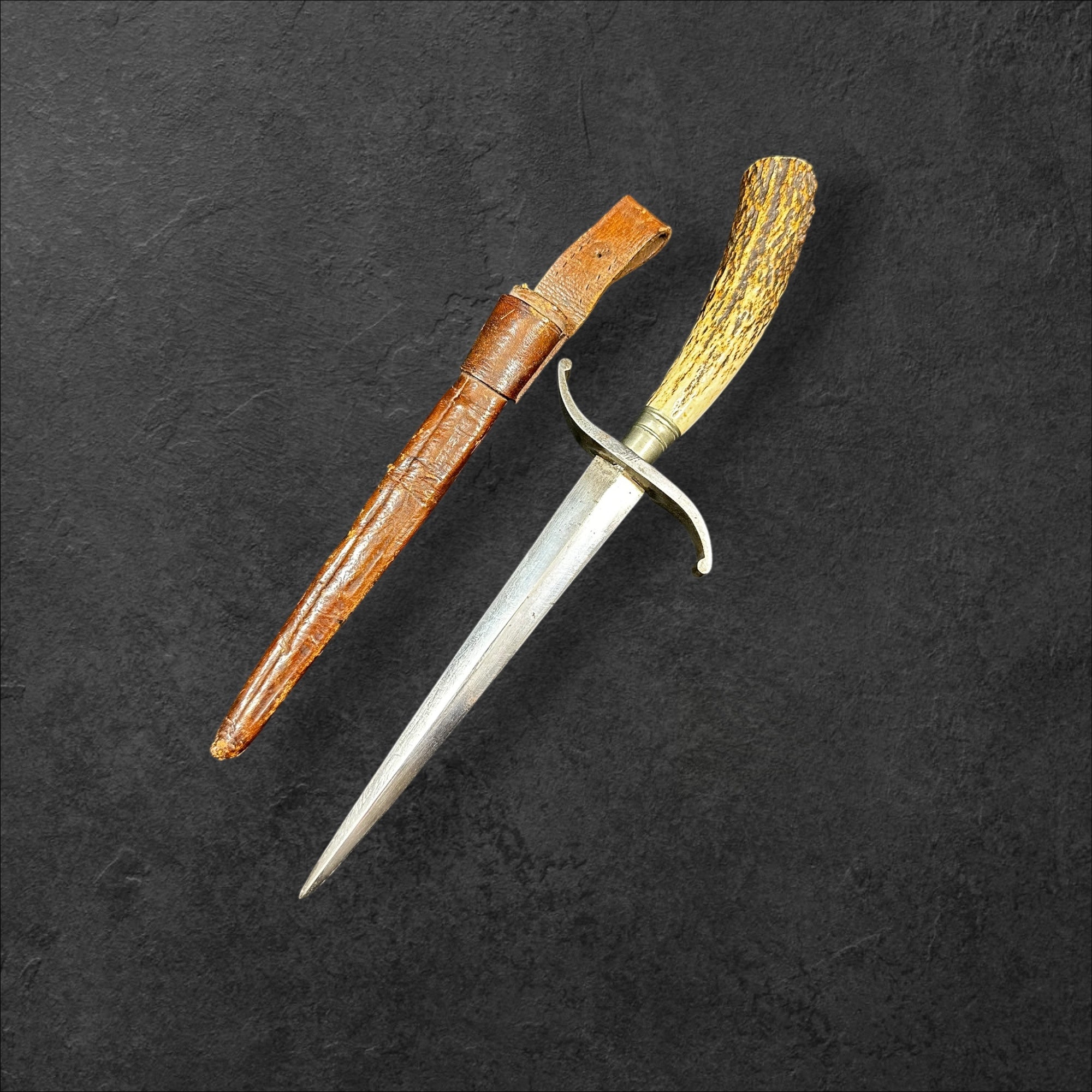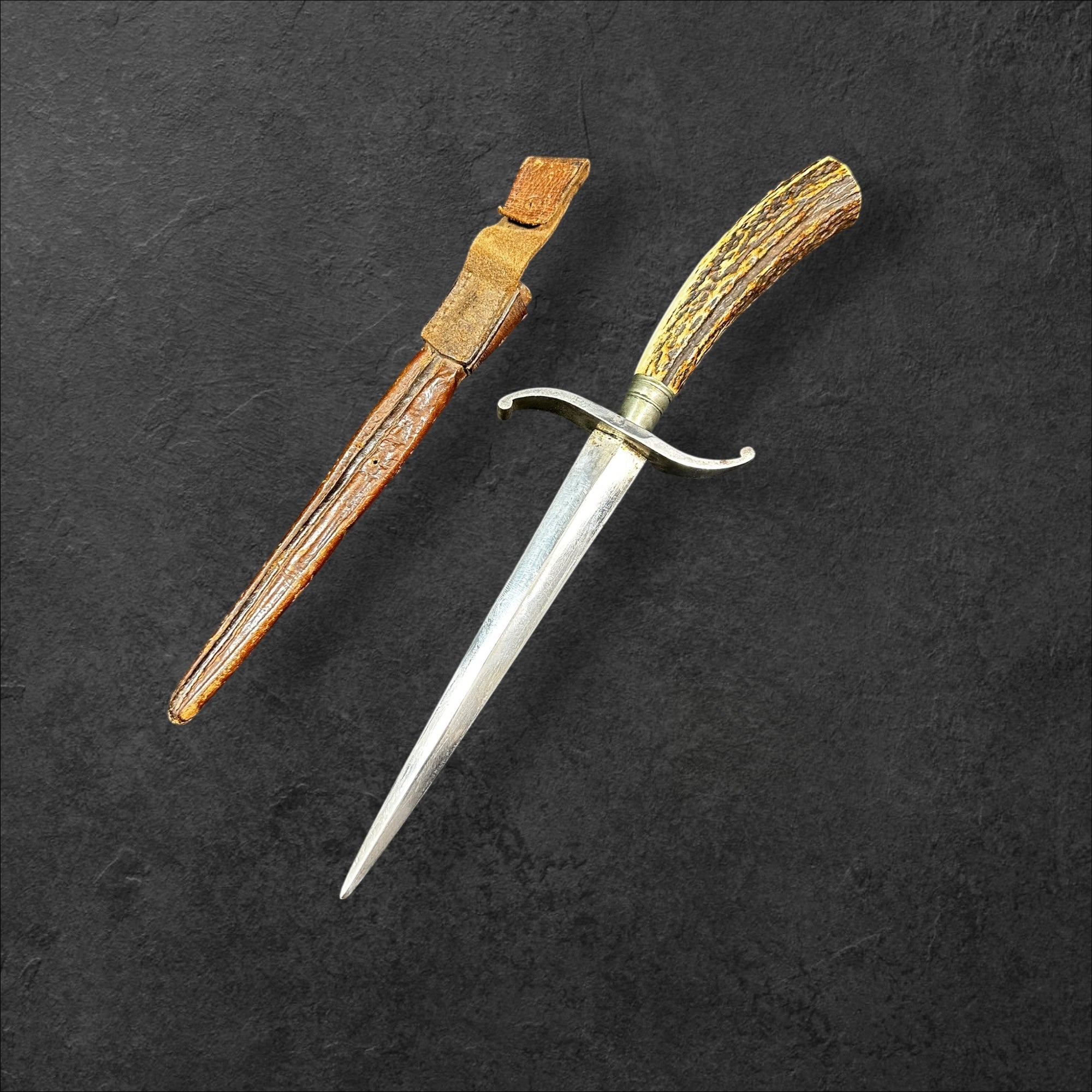 Ein ziviler Jagddolch mit doppelseitiger Klinge und passender Lederscheide, wohl um 1910, Griffstück aus Hirschhorn
