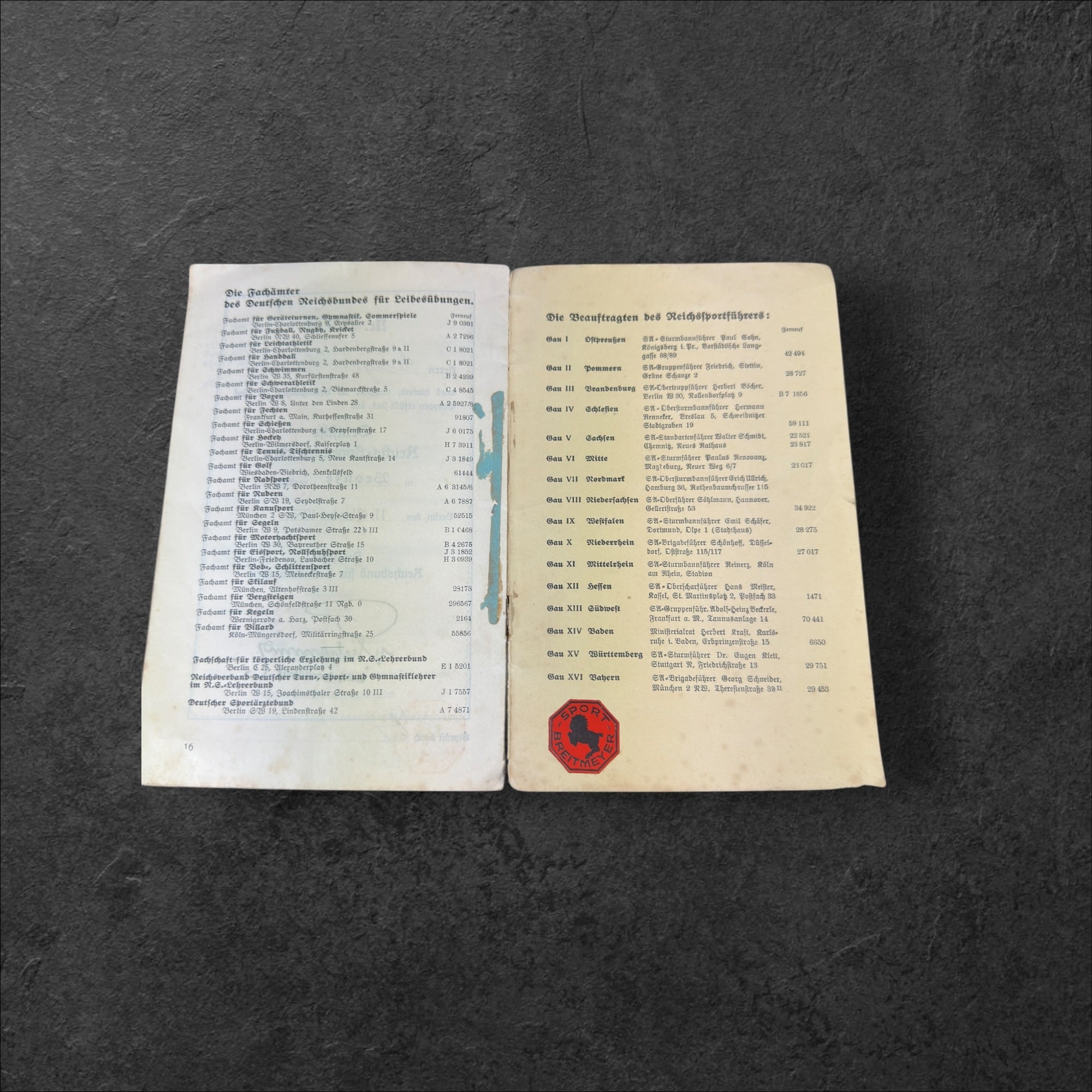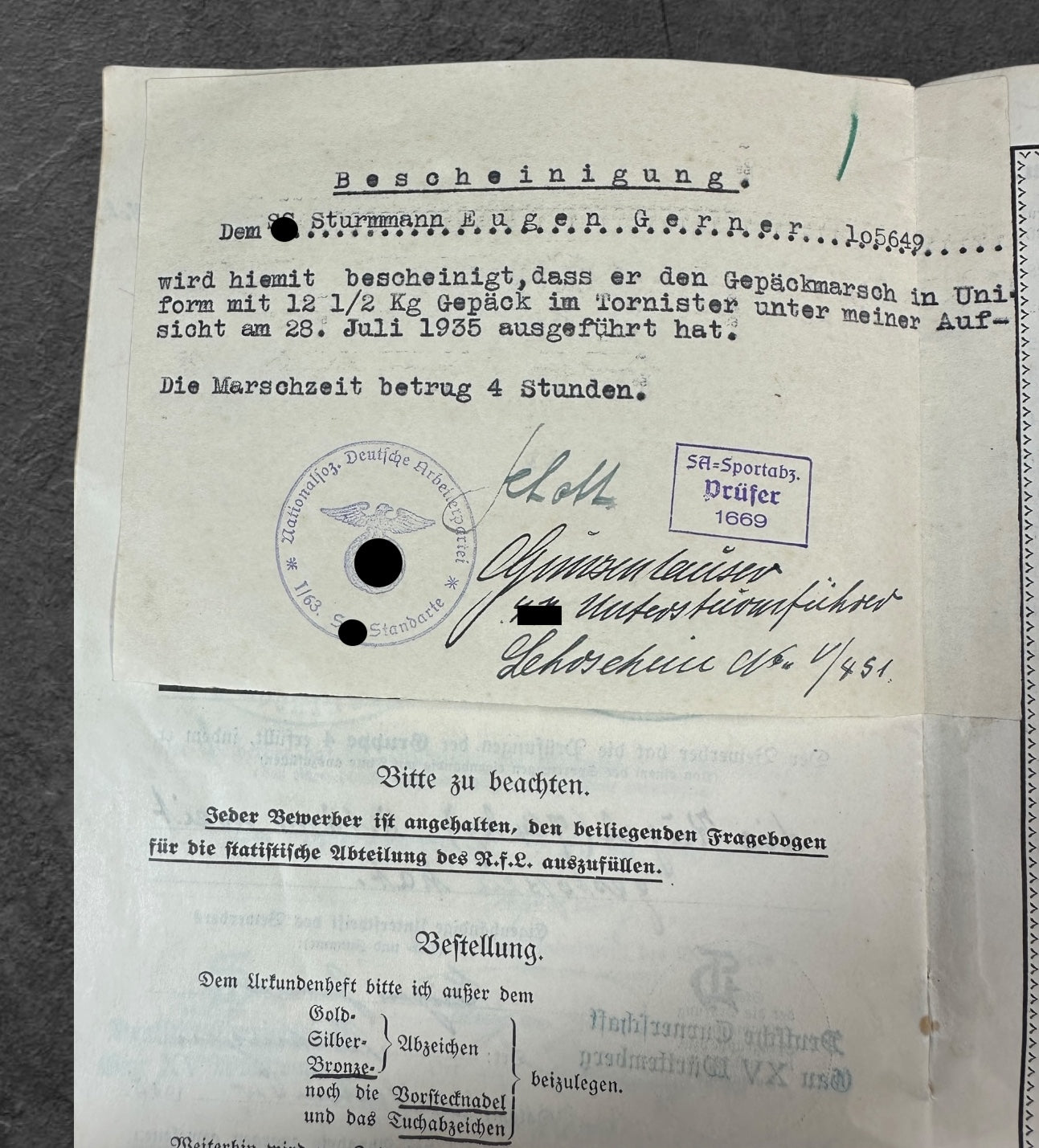 Nachweisheft für das Deutsche Reichssportabzeichen für den SS-Sturmmann Eugen Gerner. Sehr interessantes Dokument, auf dem Passbild trägt er eine Mitgliedsnadel der SS