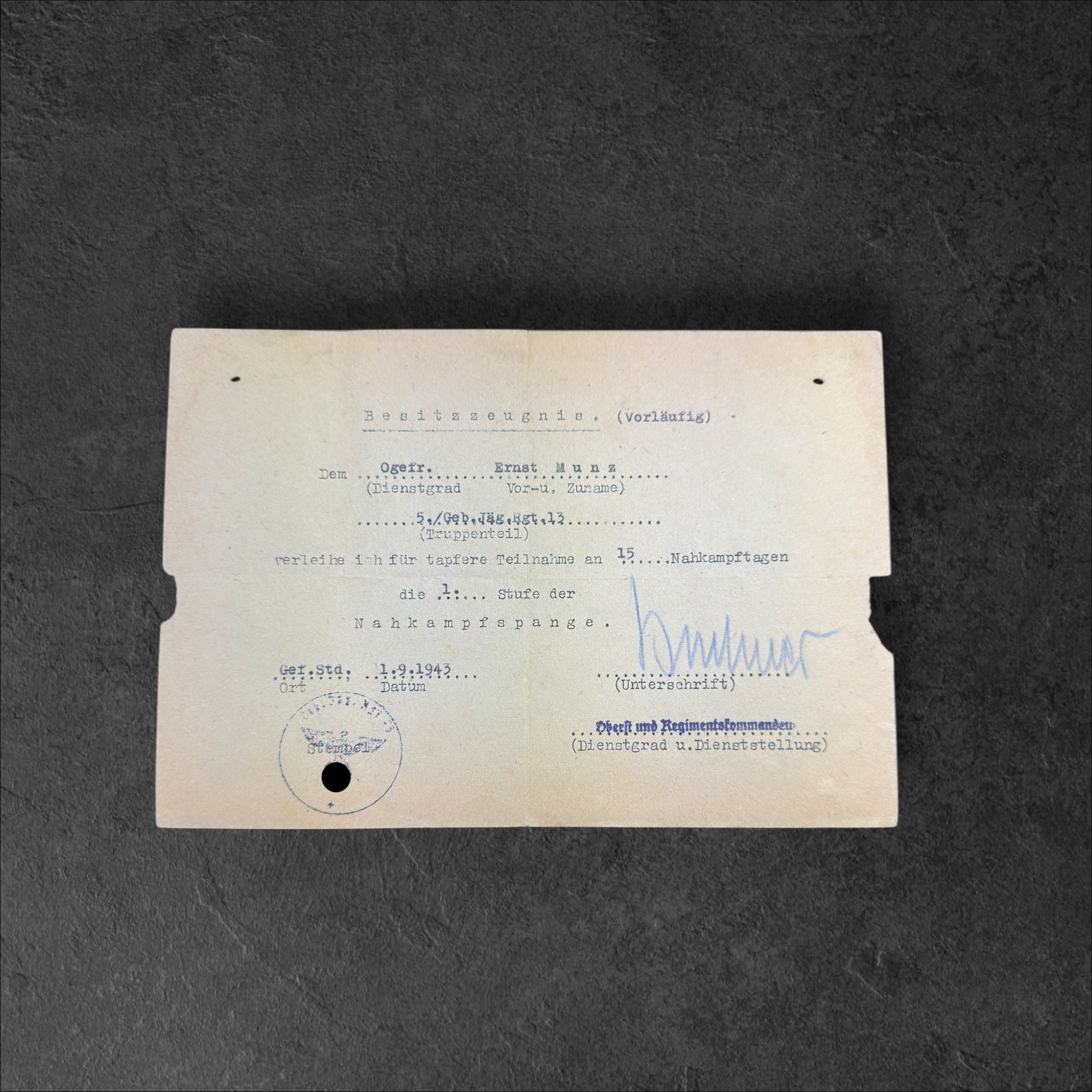 -Nahkampfspange 1.Stufe mit VB (1.9.1943 Oberst Johann Buchner, DKiG)