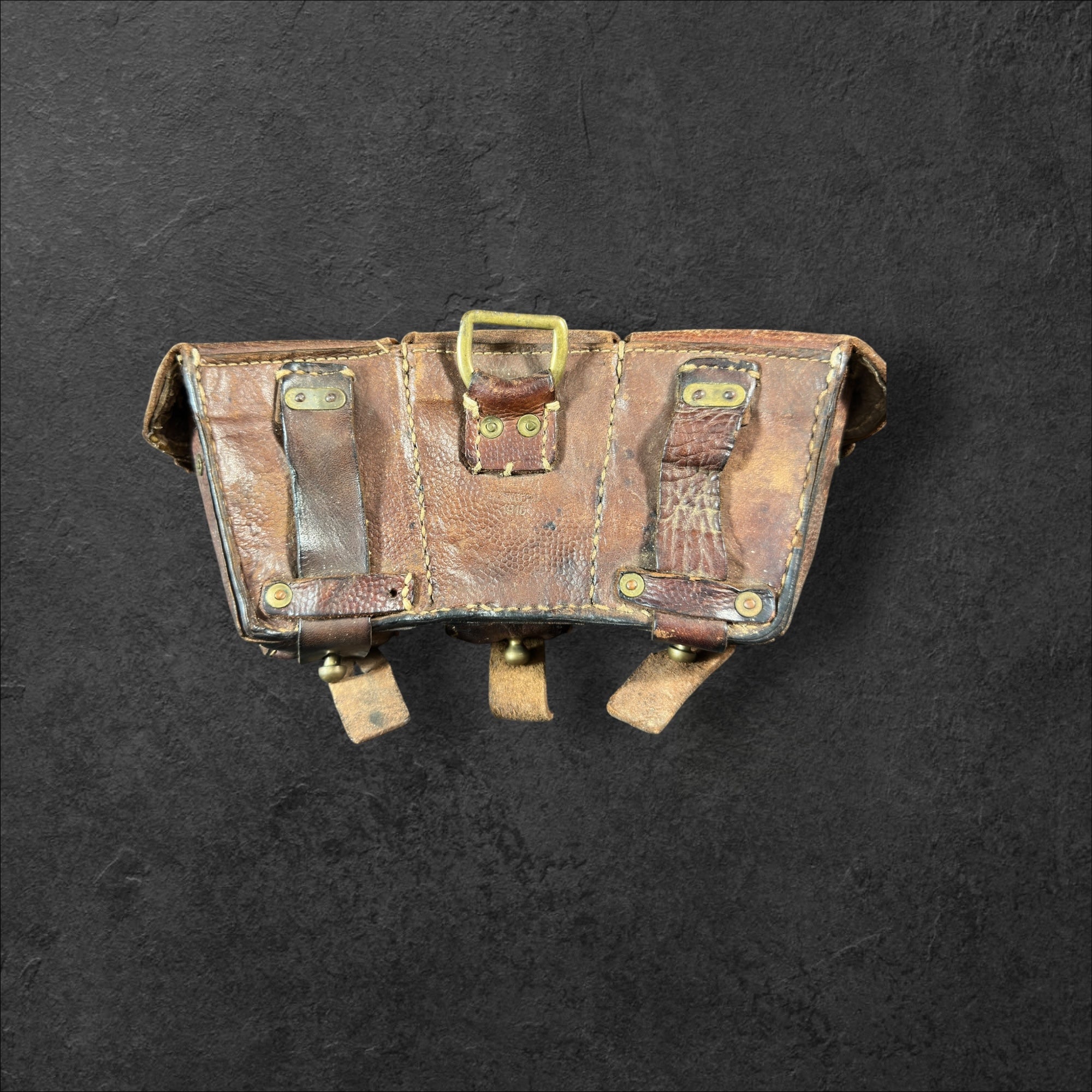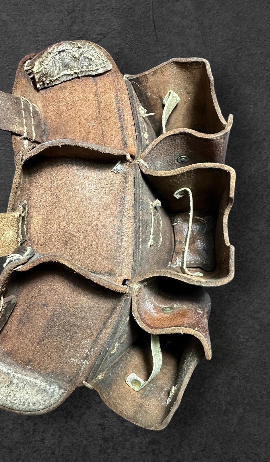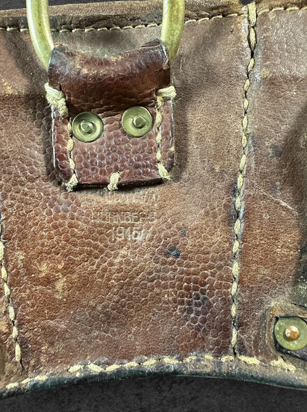 Eine gut erhaltene Patronentasche aus dem Kaiserreich mit Markierung des Herstellers Braun aus Nürnberg. Als Besonderheit auf der vorderen Seite der mittleren Tasche ein Truppenstempel 4.Ch.R 1915 für das Kgl. Bayer. 4. Chevaulegers-Regiment von 1915. Die Tasche ist noch schön farbfrisch und das Leder geschmeidig