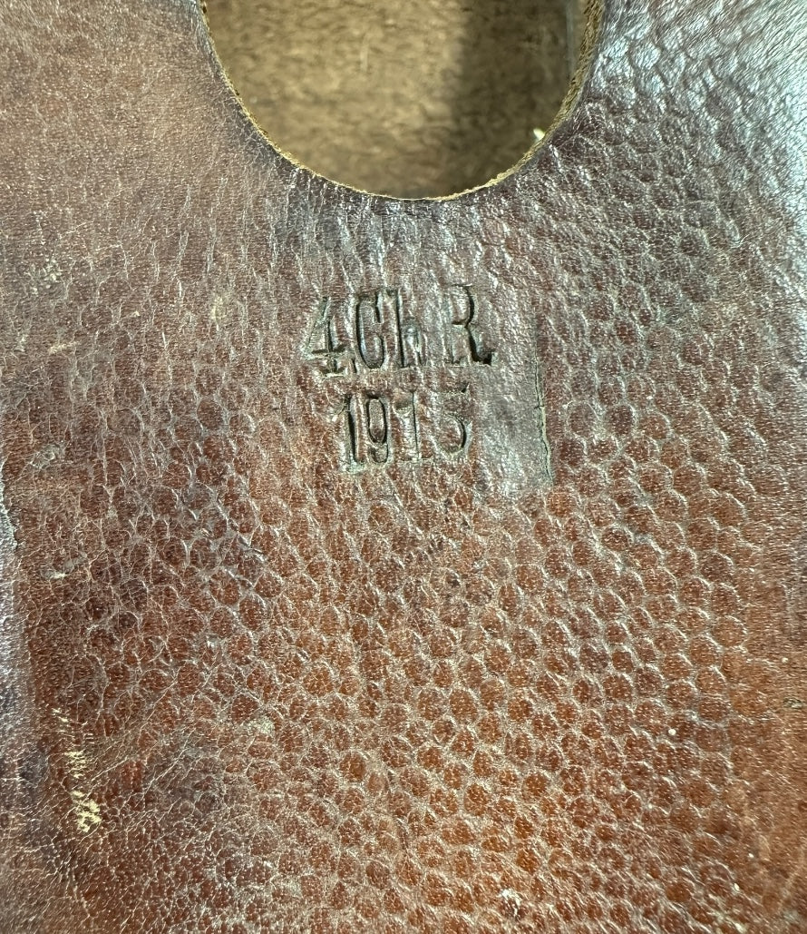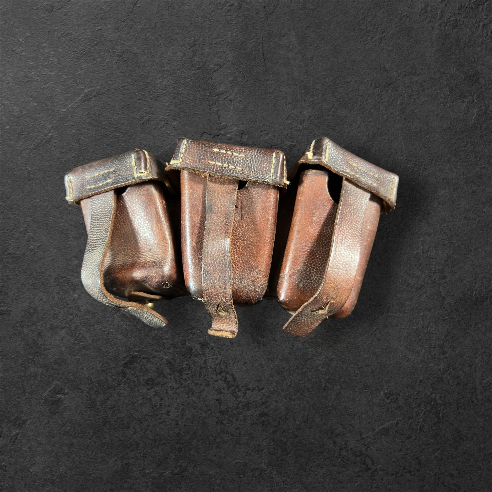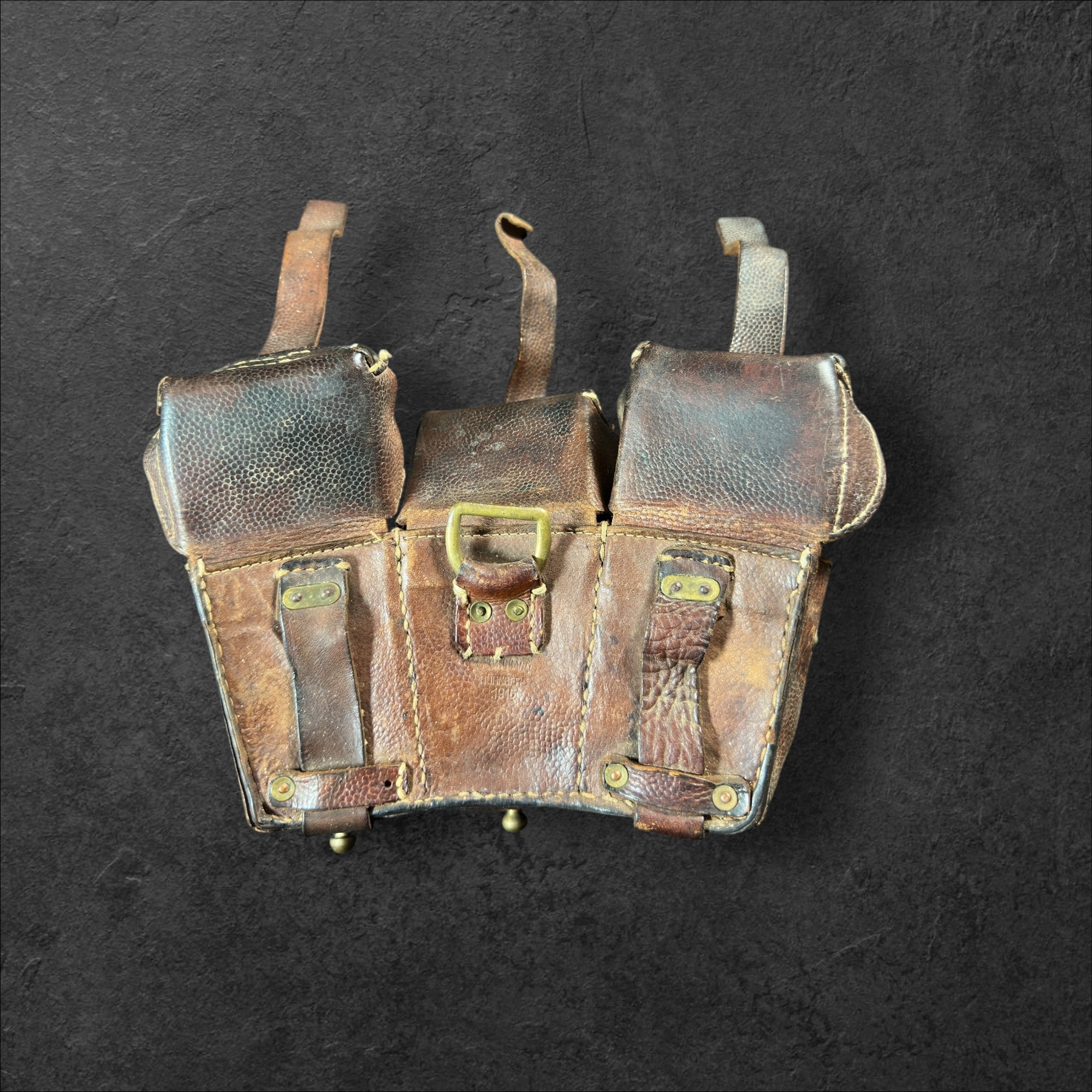 Eine gut erhaltene Patronentasche aus dem Kaiserreich mit Markierung des Herstellers Braun aus Nürnberg. Als Besonderheit auf der vorderen Seite der mittleren Tasche ein Truppenstempel 4.Ch.R 1915 für das Kgl. Bayer. 4. Chevaulegers-Regiment von 1915. Die Tasche ist noch schön farbfrisch und das Leder geschmeidig