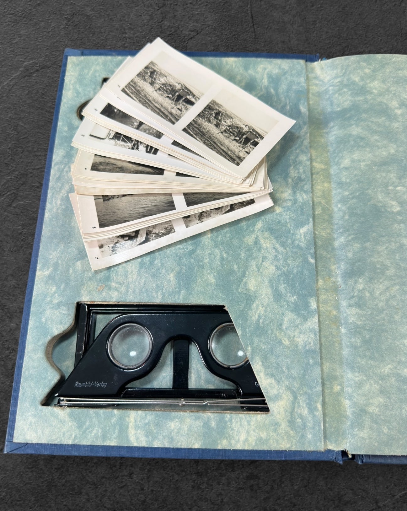 Gut erhaltenes Raumbildalbum in der seltenen blauen Ausgabe, komplett mit Brille und allen Karten