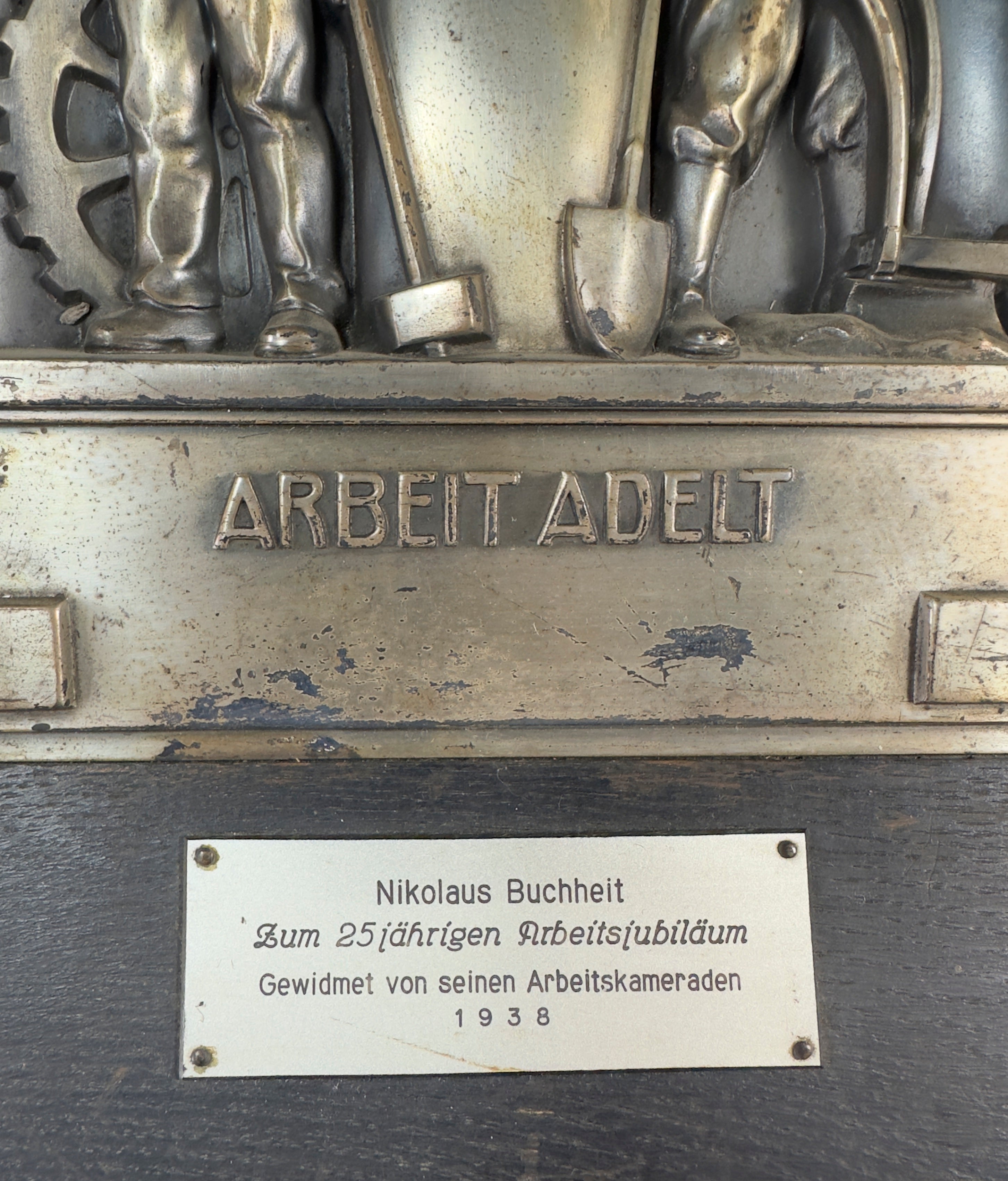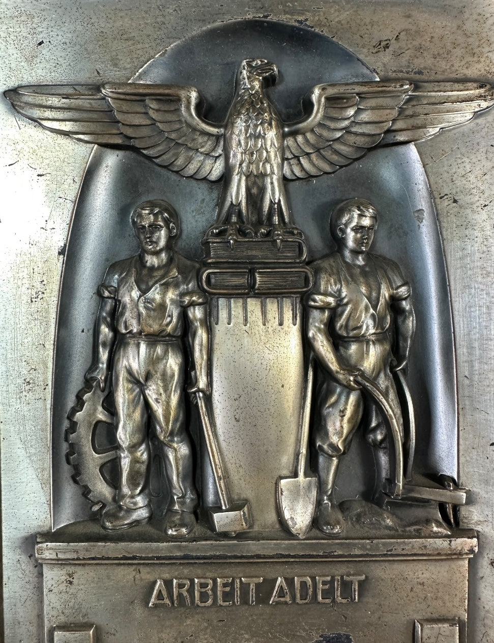 Ein sehr gut erhaltenes Wandrelief des RAD zum 25 jährigen Arbeitsjubiläum 1938. Sehr dekorativ mit starkem Motiv