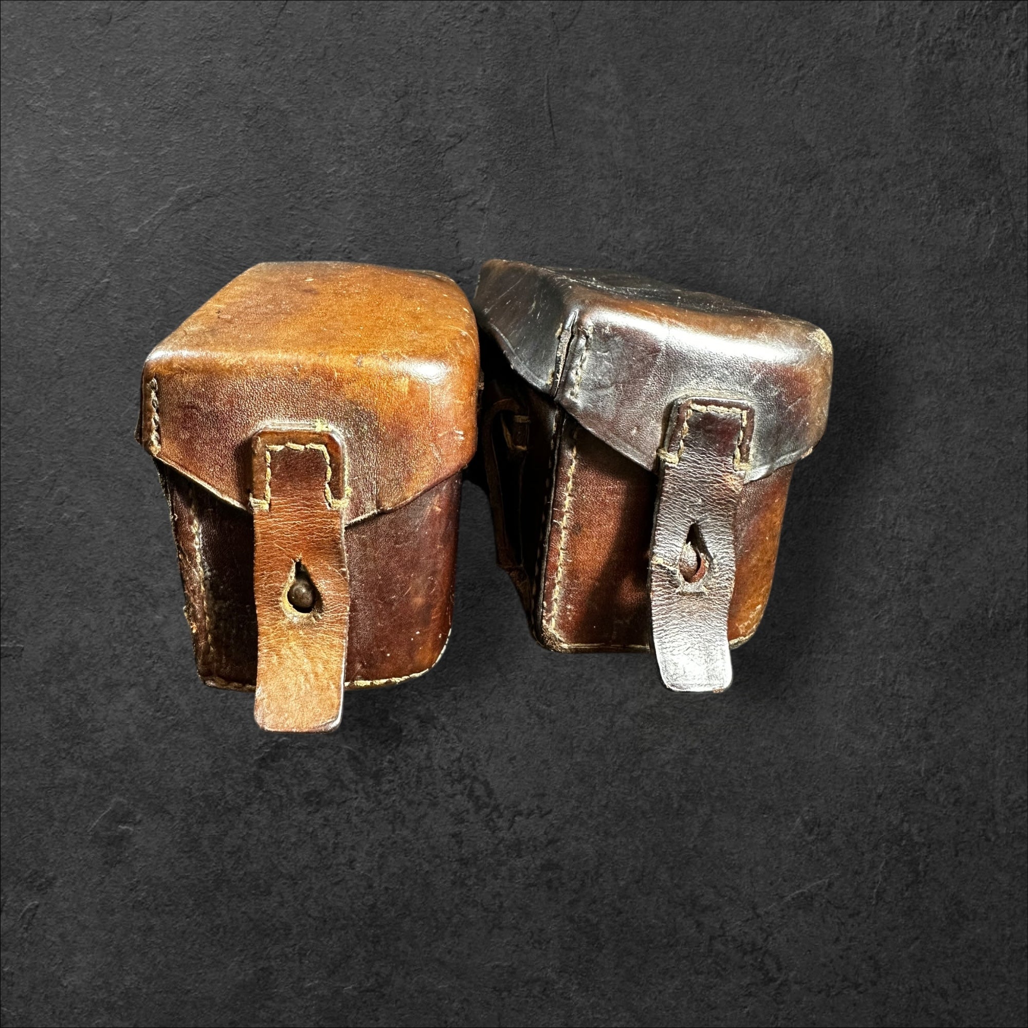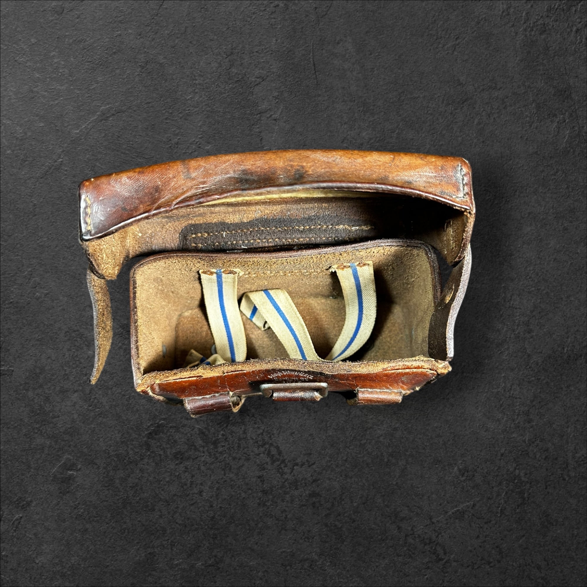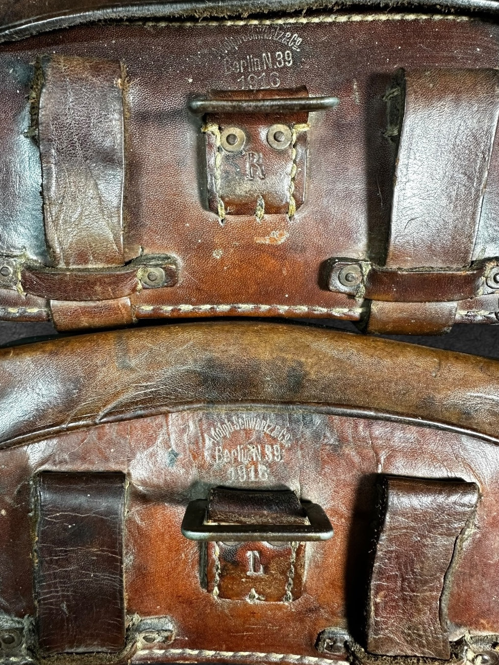Ein sehr selten zu findendes Paar Sanitätstaschen in leicht getragenen Zustand. Die Stücke paarig und beide vom Hersteller Adolph Schwartz &Co, Berlin N.39, 1916. Zusätzlich mit "L" und "R" gekennzeichnet. Komplett mit Packzettel und Innenleben
