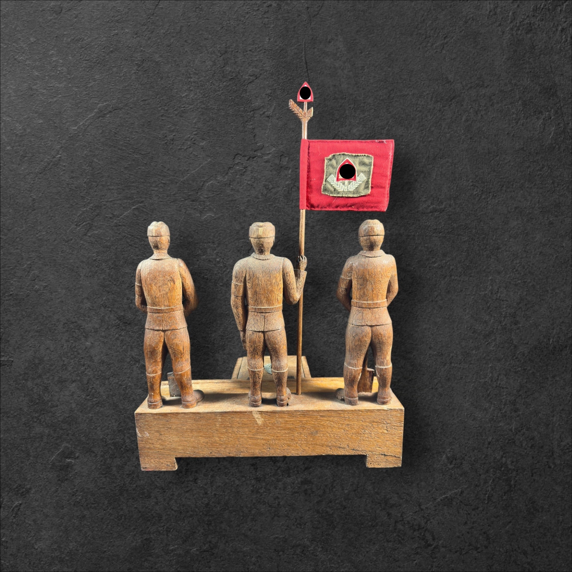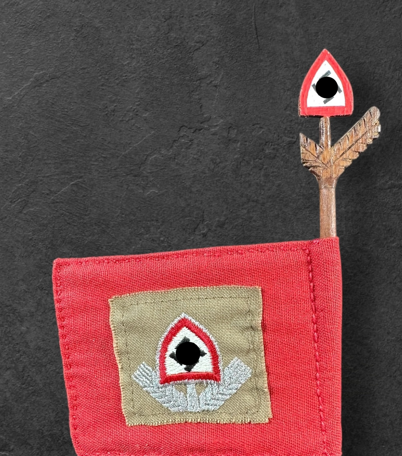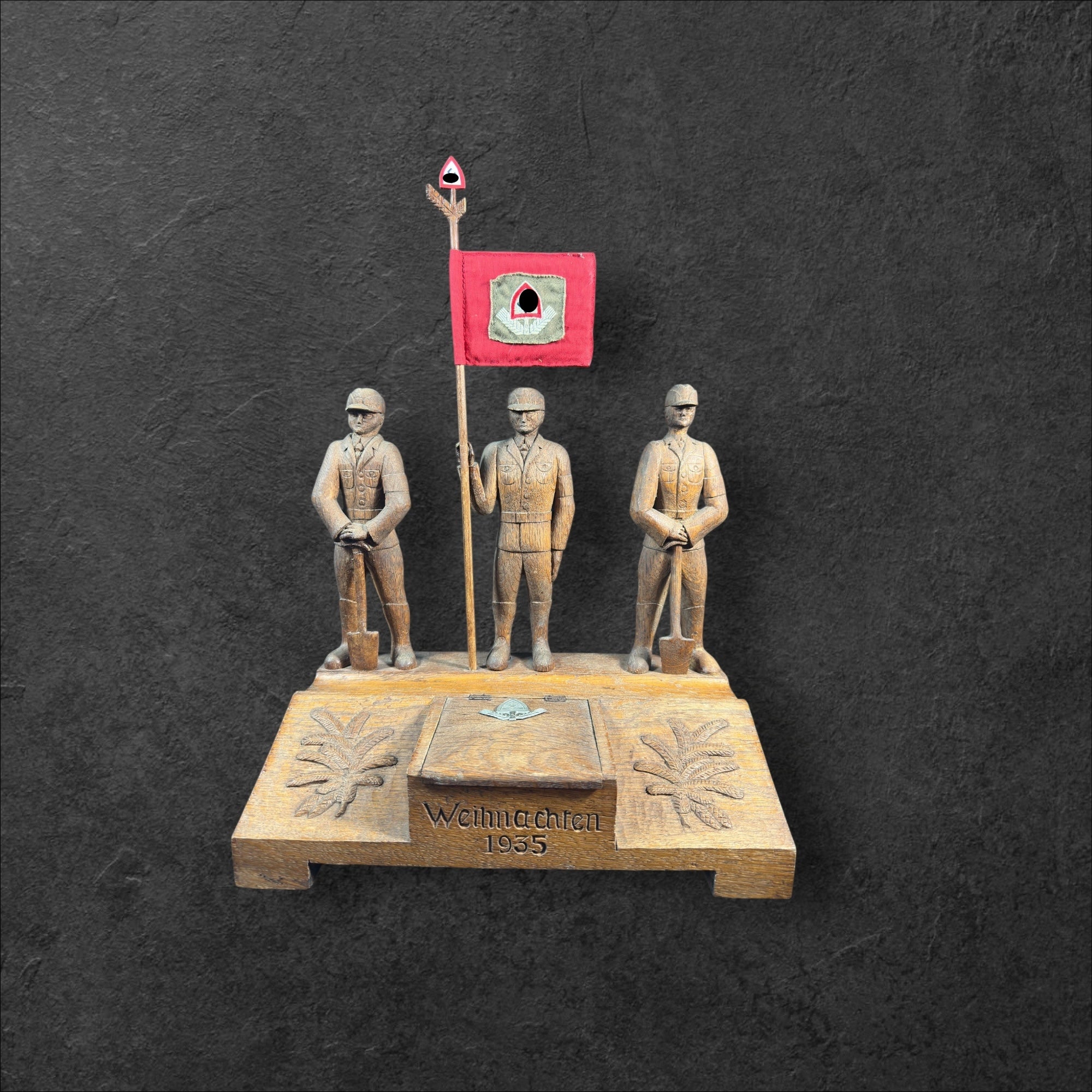 Grosse, wunderschön und Detailreich gearbeitete Schreibtischdekoration eines RAD Mann. Auf dem Deckel des Tintenfass ist ein Mützenabzeichen befestigt. Die Fahne mit 2 Stoffabzeichen versehen. Eine Seite der Fahnenspitze fehlt, dennoch ein aussergewöhnliches Stück
