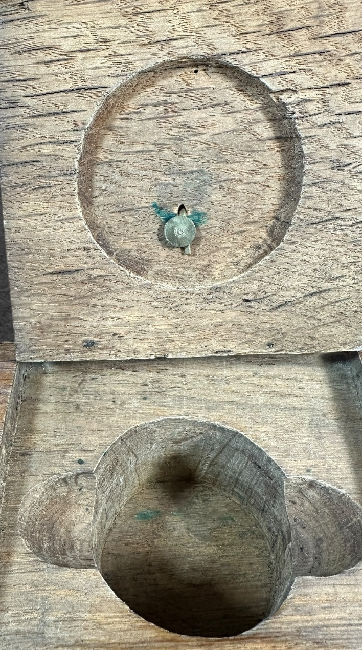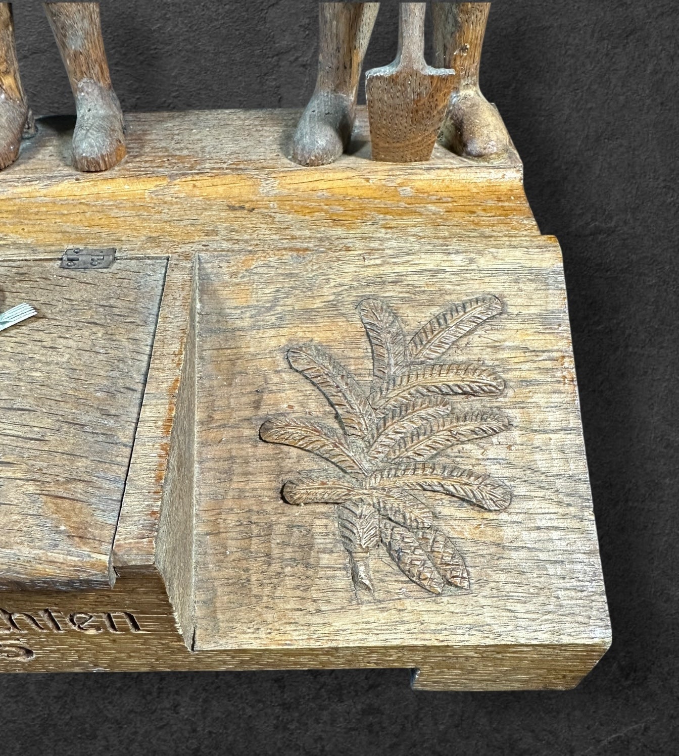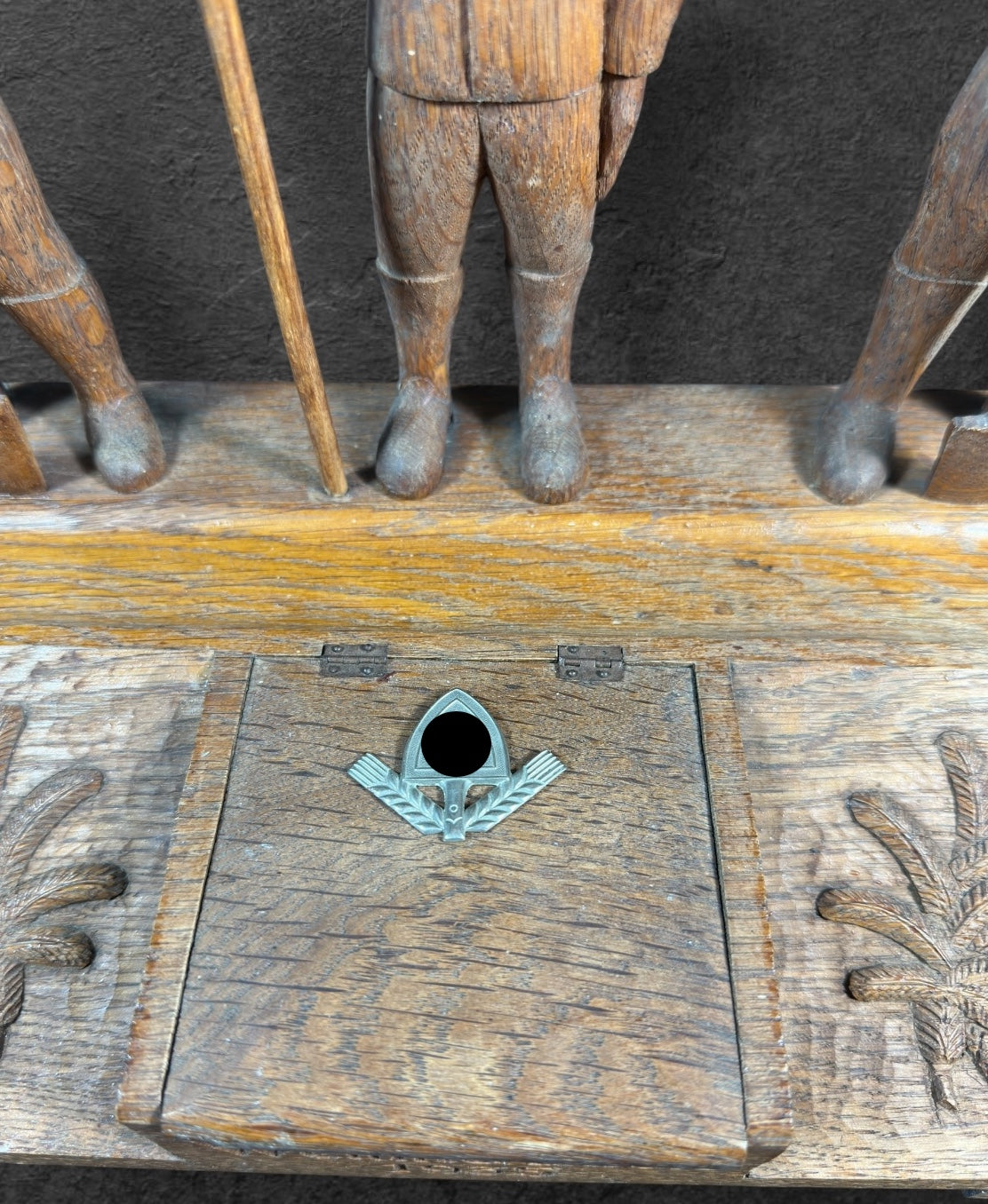 Grosse, wunderschön und Detailreich gearbeitete Schreibtischdekoration eines RAD Mann. Auf dem Deckel des Tintenfass ist ein Mützenabzeichen befestigt. Die Fahne mit 2 Stoffabzeichen versehen. Eine Seite der Fahnenspitze fehlt, dennoch ein aussergewöhnliches Stück